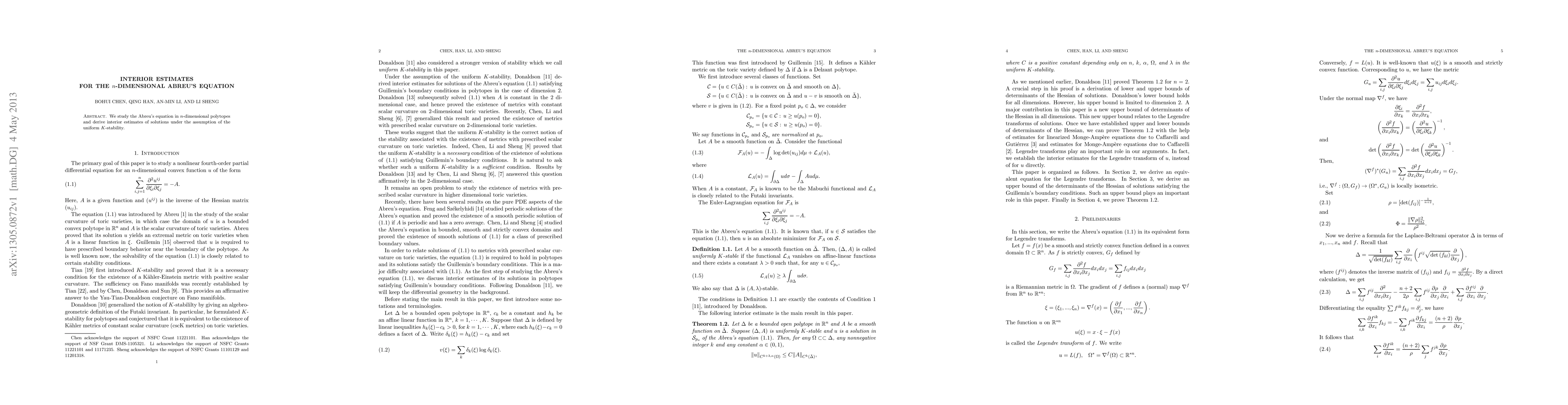 Summary: This paper investigates the Abreu's equation within n-dimensional polytopes and establishes interior estimates for its solutions, assuming the uniform K-stability condition is met. The findings contribute to the understanding of the equation's behavior under specified stability assumptions.
