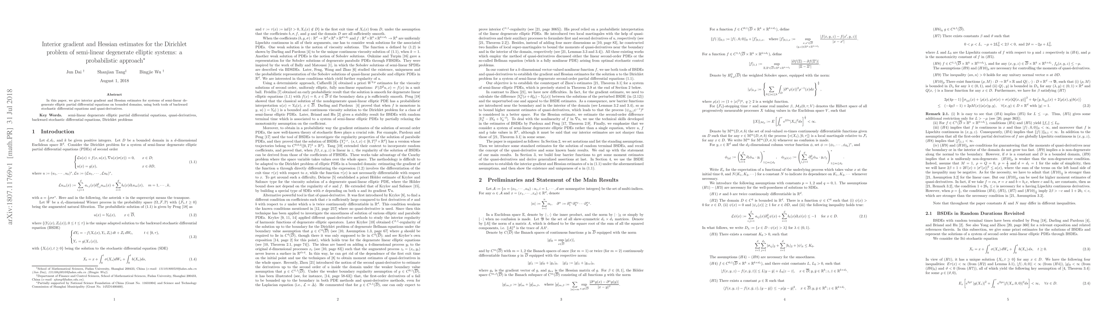 Summary: This paper provides interior gradient and Hessian estimates for semi-linear degenerate elliptic systems via probabilistic methods, employing backward stochastic differential equations and quasi-derivatives. The approach offers new insights into the behavior of solutions within bounded domains.