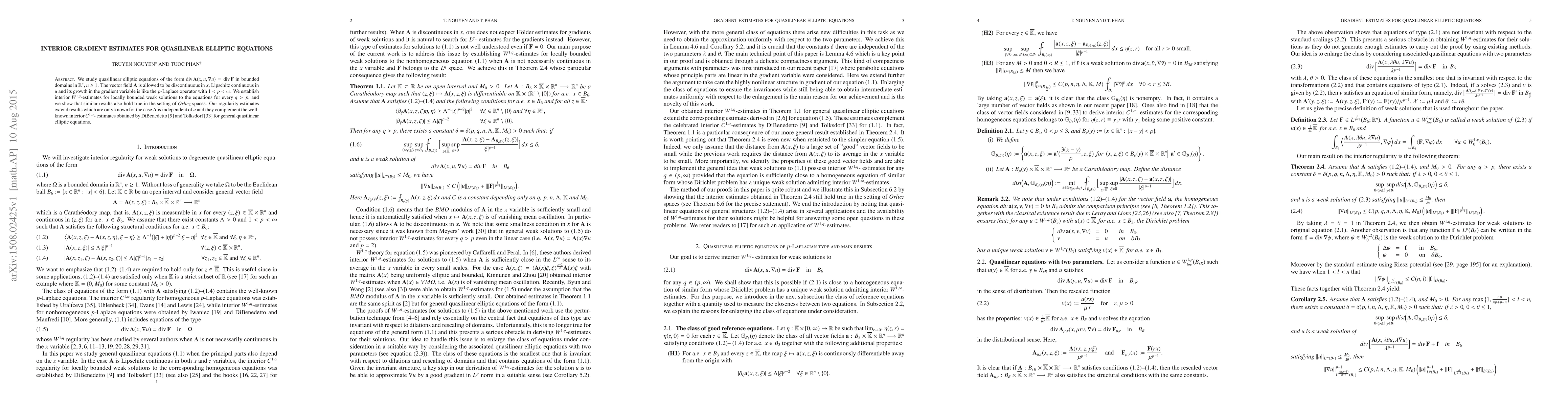 p$, and we show that similar results also hold true in the setting of {\it Orlicz} spaces. Our regularity estimates extend results which are only known for the case $\mathbf{A}$ is independent of $u$ and they complement the well-known interior $C^{1,\alpha}$- estimates obtained by DiBenedetto \cite{D} and Tolksdorf \cite{T} for general quasilinear elliptic equations.