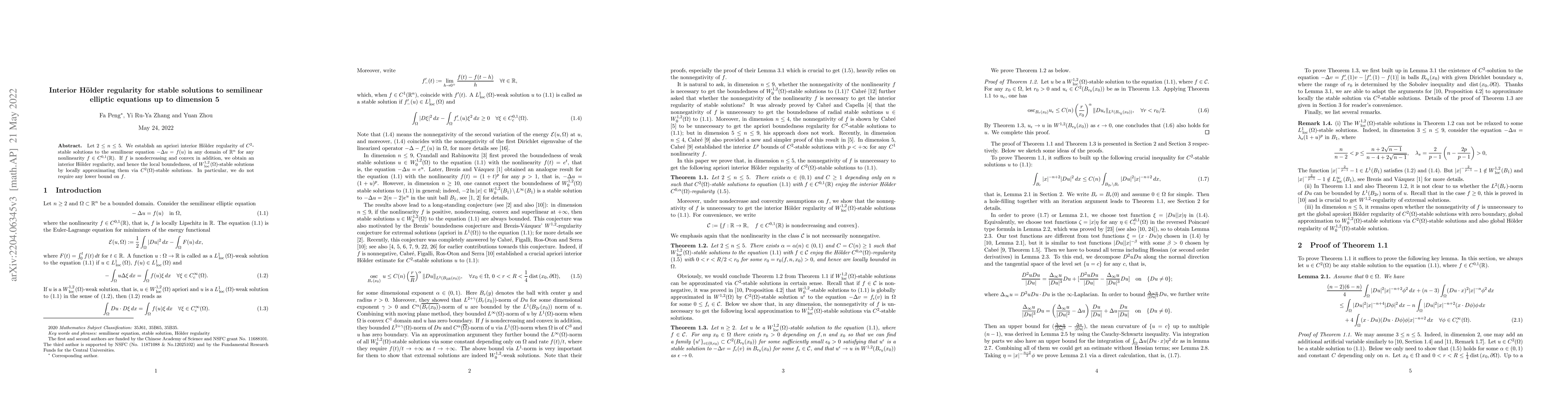 This paper proves interior H\"older regularity for $C^2$-stable solutions to semilinear elliptic equations in dimensions $2\le n\le 5$. It also establishes local boundedness for $W^{1,2}(\Omega)$-stable solutions under additional convexity and nondecreasing conditions on the nonlinearity $f$.