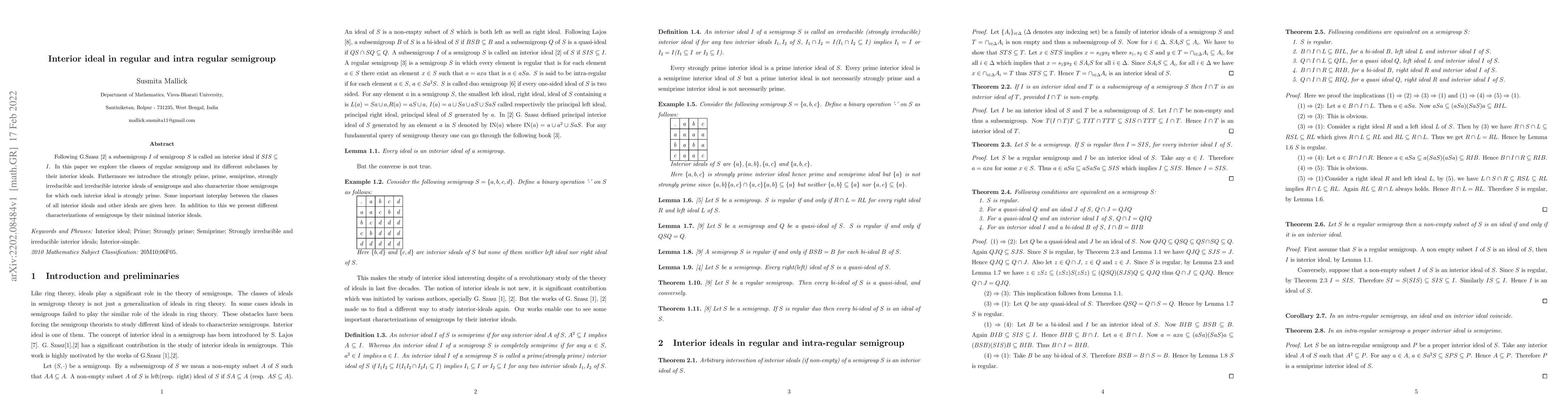 This paper investigates interior ideals in regular and intra regular semigroups, introducing various types of interior ideals and characterizing semigroups where each interior ideal is strongly prime. It also explores the relationships between these interior ideals and other types of ideals, along with characterizations based on minimal interior ideals.