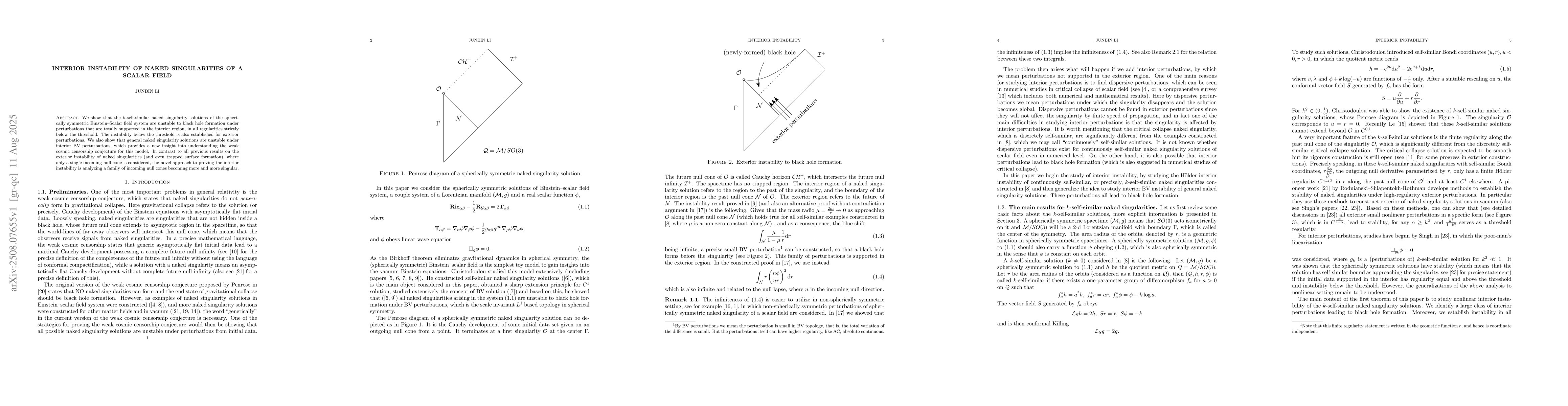 We show that the $k$-self-similar naked singularity solutions of the spherically symmetric Einstein--Scalar field system are unstable to black hole formation under perturbations that are totally supported in the interior region, in all regularities strictly below the threshold. The instability below the threshold is also established for exterior perturbations. We also show that general naked singularity solutions are unstable under interior BV perturbations, which provides a new insight into understanding the weak cosmic censorship conjecture for this model. In contrast to all previous results on the exterior instability of naked singularities (and even trapped surface formation), where only a single incoming null cone is considered, the novel approach to proving the interior instability is analyzing a family of incoming null cones becoming more and more singular.