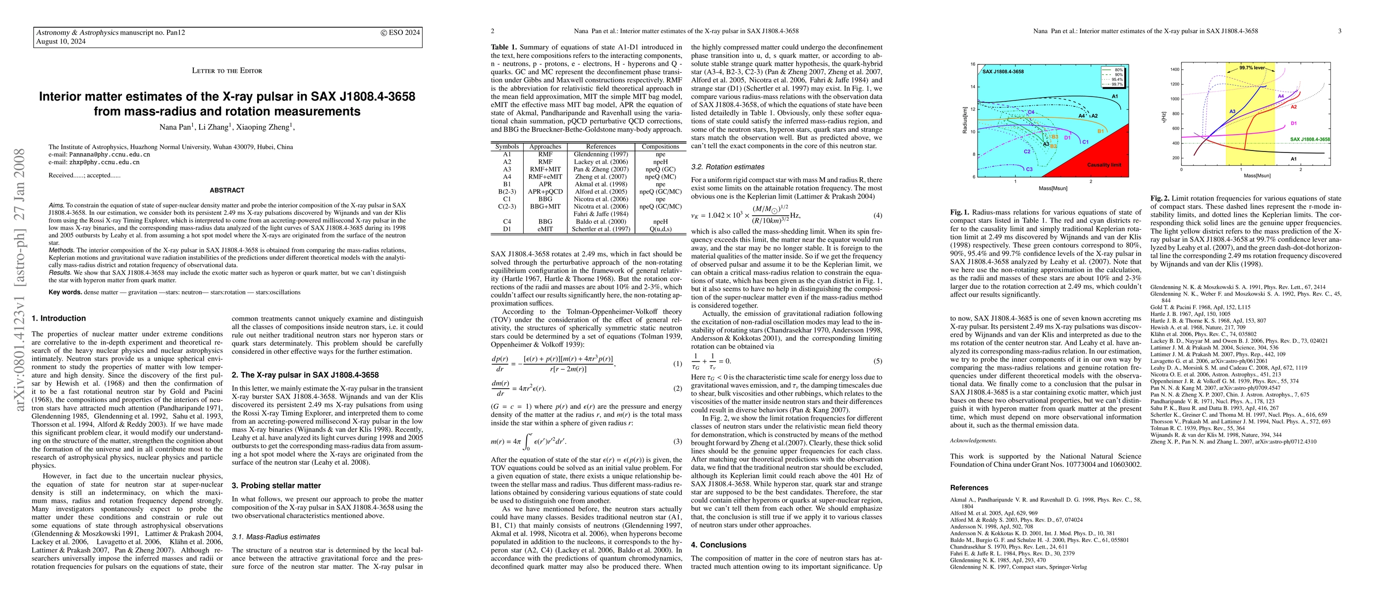 This paper estimates the interior matter of the X-ray pulsar SAX J1808.4-3658 using its mass-radius and rotation measurements to constrain the equation of state at super-nuclear densities. The study combines persistent X-ray pulsation data and light curve analysis from past observations to infer the pulsar's interior composition.
