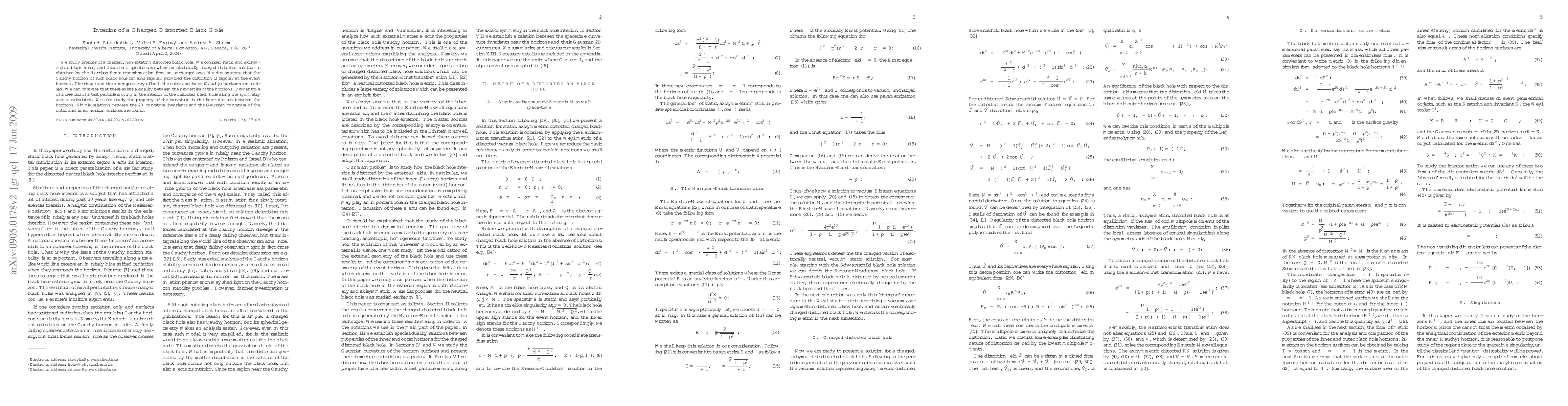 The paper presents a detailed analysis of the interior of charged distorted black holes, establishing conditions for horizon regularity and demonstrating duality between horizon properties.