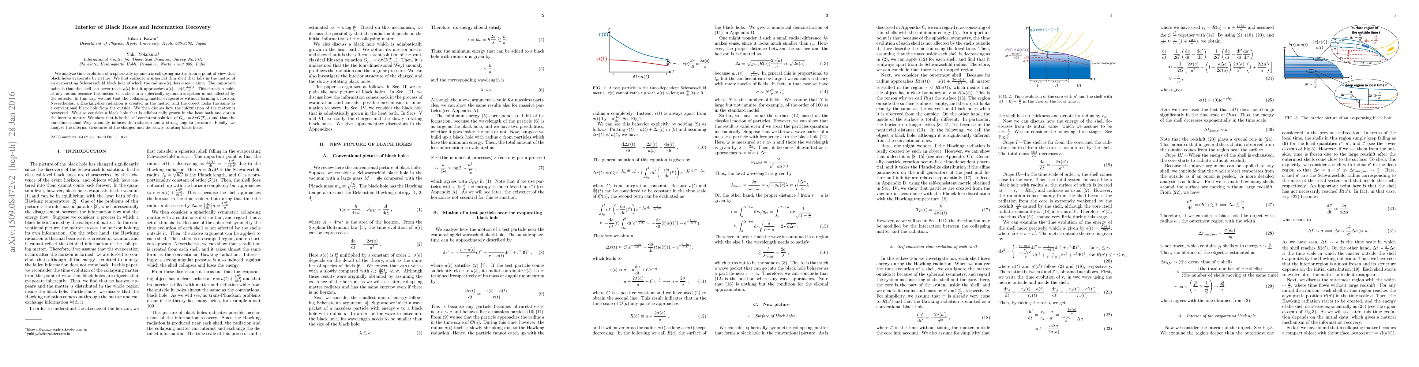 We analyze time evolution of a spherically symmetric collapsing matter from a point of view that black holes evaporate by nature. We first consider a spherical thin shell that falls in the metric of an evaporating Schwarzschild black hole of which the radius $a(t)$ decreases in time. The important point is that the shell can never reach $a(t)$ but it approaches $a(t)-a(t)\frac{d a(t)}{d t}$. This situation holds at any radius because the motion of a shell in a spherically symmetric system is not affected by the outside. In this way, we find that the collapsing matter evaporates without forming a horizon. Nevertheless, a Hawking-like radiation is created in the metric, and the object looks the same as a conventional black hole from the outside. We then discuss how the information of the matter is recovered. We also consider a black hole that is adiabatically grown in the heat bath and obtain the interior metric. We show that it is the self-consistent solution of $G_{\mu\nu}=8\pi G \langle T_{\mu\nu} \rangle$ and that the four-dimensional Weyl anomaly induces the radiation and a strong angular pressure. Finally, we analyze the internal structures of the charged and the slowly rotating black holes.