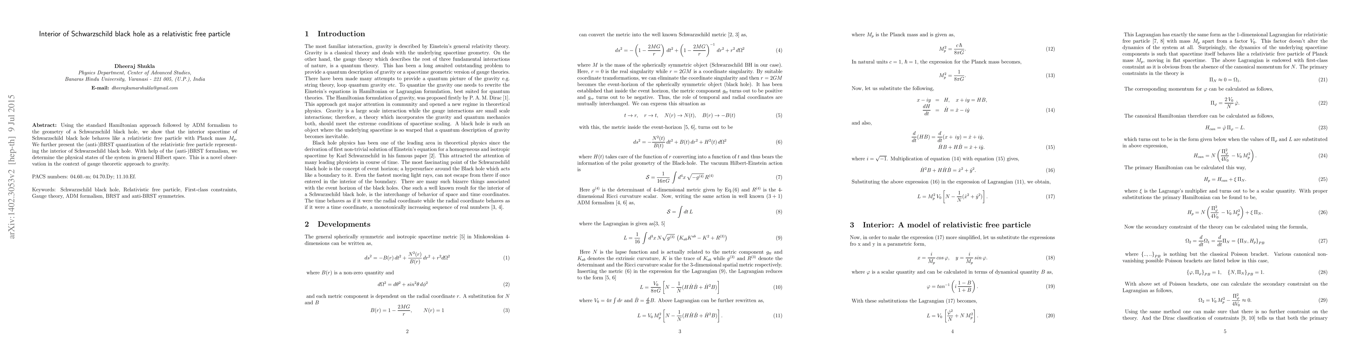 This paper demonstrates that the interior of a Schwarzschild black hole can be modeled as a relativistic free particle with Planck mass using the ADM formalism and (anti-)BRST quantization, revealing novel insights into the gauge theoretical approach to gravity. The study determines the physical states of the system within the general Hilbert space.