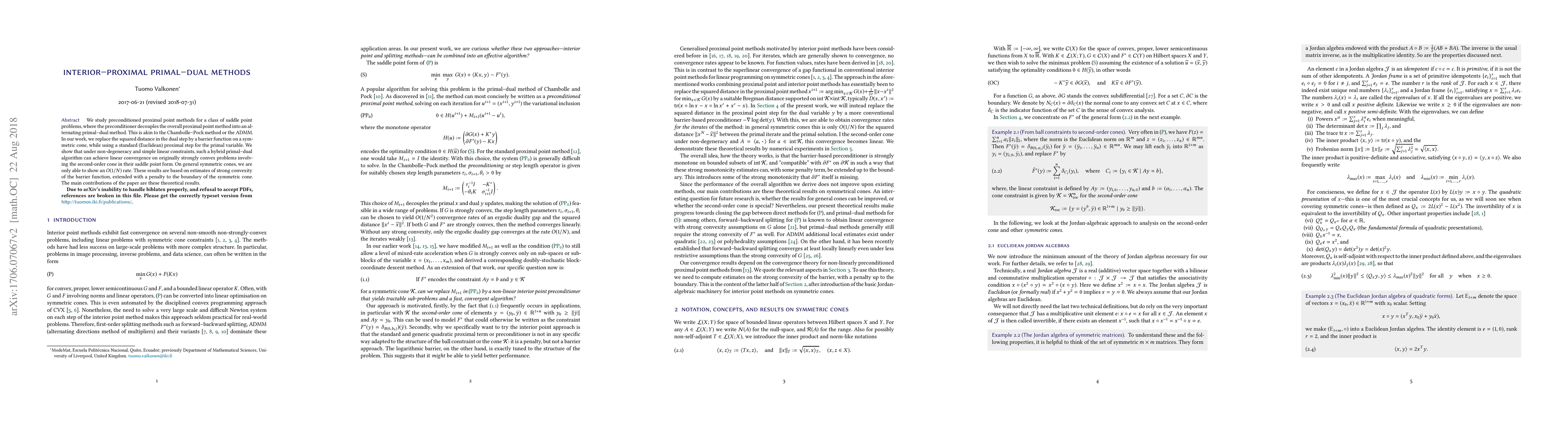 This paper investigates preconditioned proximal point methods for saddle point problems, transforming them into alternating primal-dual algorithms. The authors propose a hybrid method using a barrier function on symmetric cones for the dual step and a standard proximal step for the primal variable, achieving linear convergence for strongly convex problems.