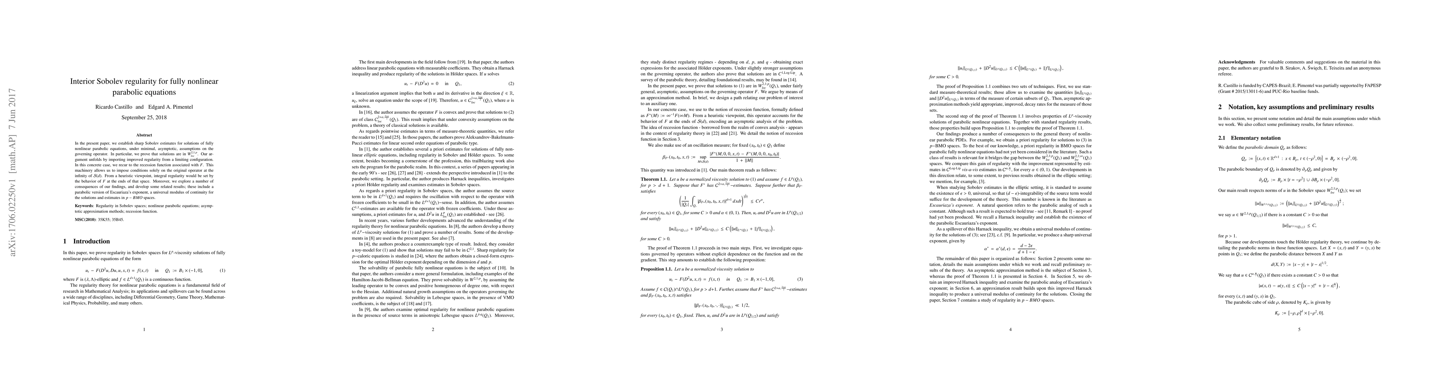 In the present paper, we establish sharp Sobolev estimates for solutions of fully nonlinear parabolic equations, under minimal, asymptotic, assumptions on the governing operator. In particular, we prove that solutions are in $W^{2,1;p}_{loc}$. Our argument unfolds by importing improved regularity from a limiting configuration. In this concrete case, we recur to the recession function associated with $F$. This machinery allows us to impose conditions solely on the original operator at the infinity of $\mathcal{S}(d)$. From a heuristic viewpoint, integral regularity would be set by the behavior of $F$ at the ends of that space. Moreover, we explore a number of consequences of our findings, and develop some related results; these include a parabolic version of Escauriaza's exponent, a universal modulus of continuity for the solutions and estimates in $p-BMO$ spaces.