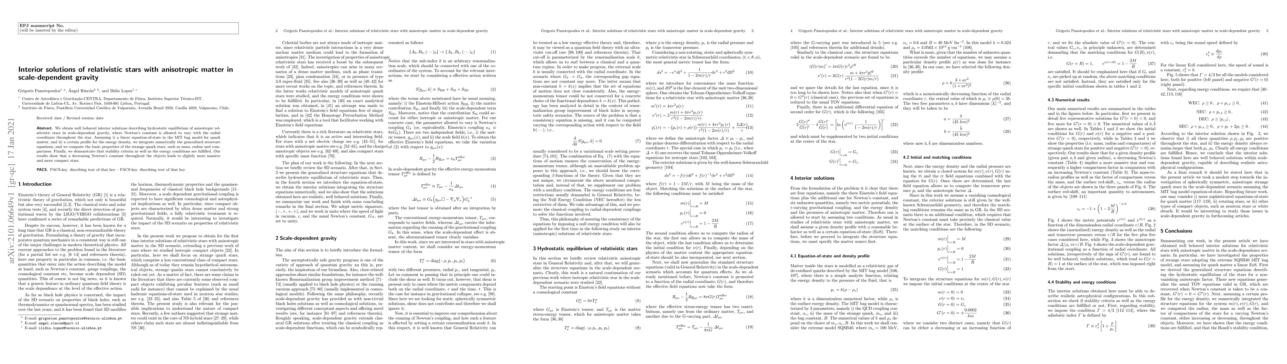 We obtain well behaved interior solutions describing hydrostatic equilibrium of anisotropic relativistic stars in scale-dependent gravity, where Newton's constant is allowed to vary with the radial coordinate throughout the star. Assuming i) a linear equation-of-state in the MIT bag model for quark matter, and ii) a certain profile for the energy density, we integrate numerically the generalized structure equations, and we compute the basic properties of the strange quark stars, such as mass, radius and compactness. Finally, we demonstrate that stability criteria as well as the energy conditions are fulfilled. Our results show that a decreasing Newton's constant throughout the objects leads to slightly more massive and more compact stars.