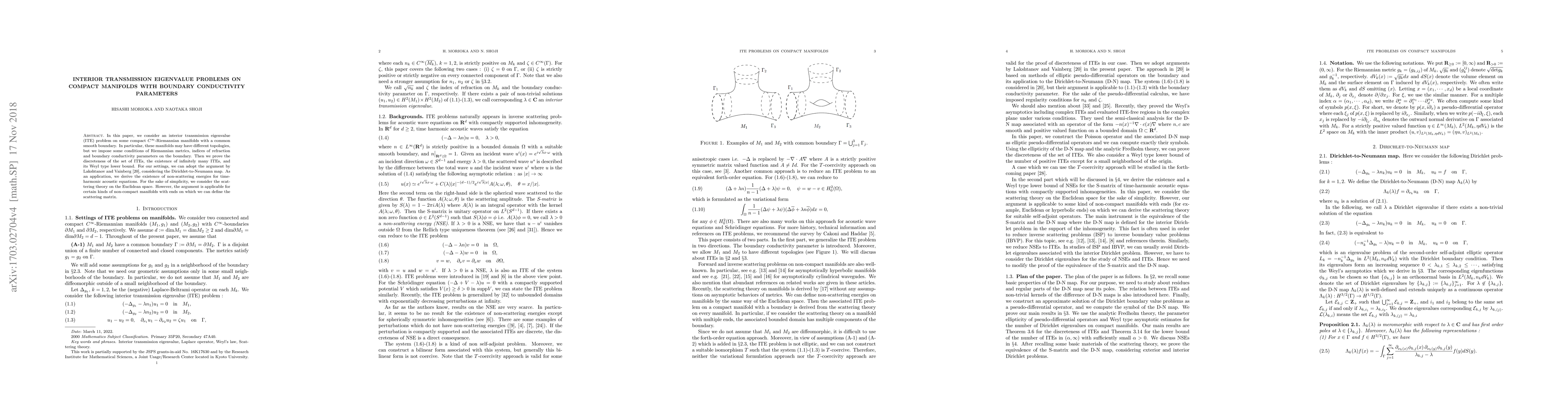 In this paper, we consider an interior transmission eigenvalue (ITE) problem on some compact $C^{\infty }$-Riemannian manifolds with a common smooth boundary. In particular, these manifolds may have different topologies, but we impose some conditions of Riemannian metrics, indices of refraction and boundary conductivity parameters on the boundary. Then we prove the discreteness of the set of ITEs, the existence of infinitely many ITEs, and its Weyl type lower bound. For our settings, we can adopt the argument by Lakshtanov and Vainberg, considering the Dirichlet-to-Neumann map. As an application, we derive the existence of non-scattering energies for time-harmonic acoustic equations. For the sake of simplicity, we consider the scattering theory on the Euclidean space. However, the argument is applicable for certain kinds of non-compact manifolds with ends on which we can define the scattering matrix.