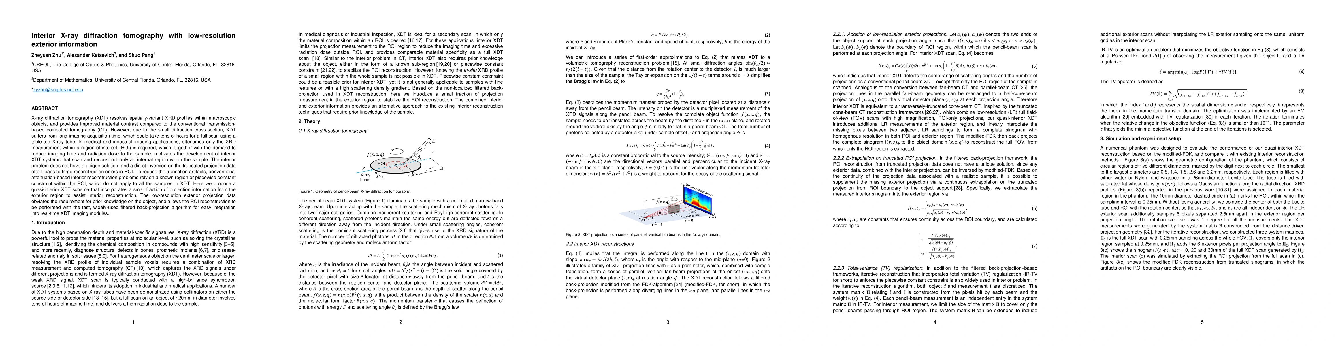 This paper proposes a quasi-interior X-ray diffraction tomography (XDT) method to reconstruct internal regions of interest (ROI) with reduced imaging time and radiation dose. It utilizes low-resolution exterior projection data to mitigate truncation artifacts, enabling the use of fast filtered back-projection for real-time imaging.