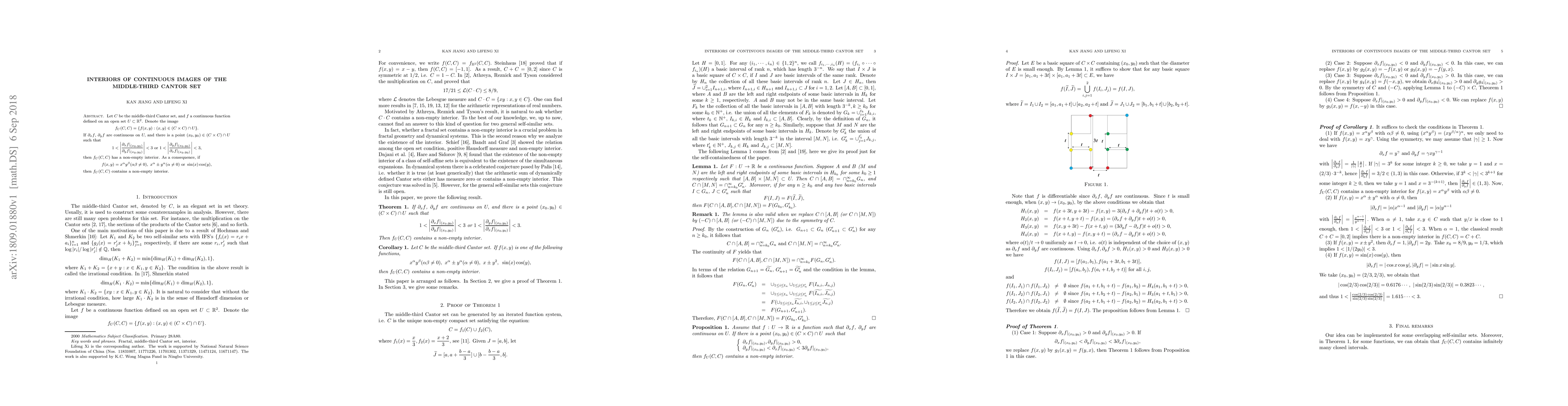 Let $C$ be the middle-third Cantor set, and $f$ a continuous function defined on an open set $U\subset \mathbb{R}^{2}$. Denote the image \begin{equation*} f_{U}(C,C)=\{f(x,y):(x,y)\in (C\times C)\cap U\}. \end{equation*} If $\partial _{x}f$, $\partial _{y}f$ are continuous on $U,$ and there is a point $(x_{0},y_{0})\in (C\times C)\cap U$ such that \begin{equation*} 1<\left\vert \frac{\partial _{x}f|_{(x_{0},y_{0})}}{\partial _{y}f|_{(x_{0},y_{0})}}\right\vert <3\text{ or }1<\left\vert \frac{\partial _{y}f|_{(x_{0},y_{0})}}{\partial _{x}f|_{(x_{0},y_{0})}}\right\vert <3, \end{equation*} then $f_{U}(C,C)$ has a non-empty interior. As a consequence, if \begin{equation*} f(x,y)=x^{\alpha }y^{\beta }(\alpha \beta \neq 0),\text{ }x^{\alpha }\pm y^{\alpha }(\alpha \neq 0)\text{ or }\sin (x)\cos (y), \end{equation*} then $f_{U}(C,C)$ contains a non-empty interior.