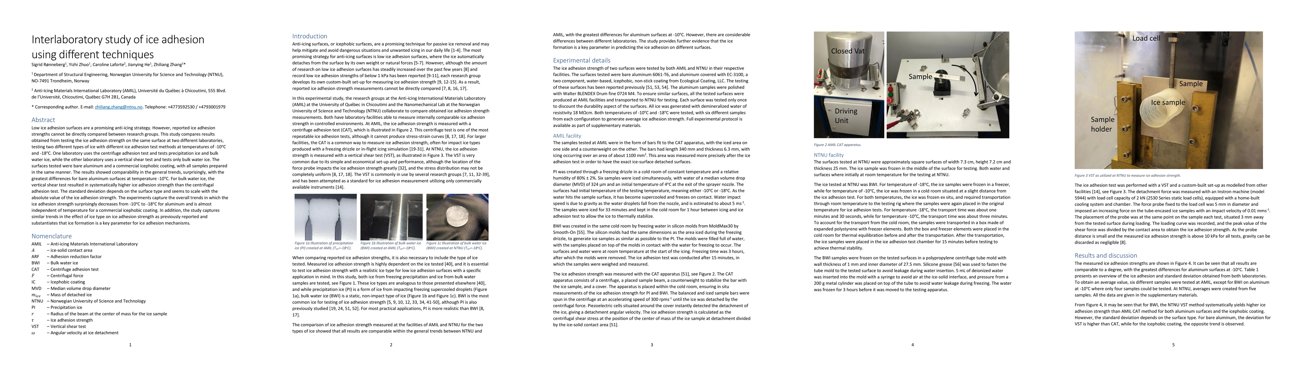 An interlaboratory study compared ice adhesion strengths on bare aluminum and an icephobic coating at two labs using different tests and temperatures, finding similar trends in surface effects and temperature dependence.