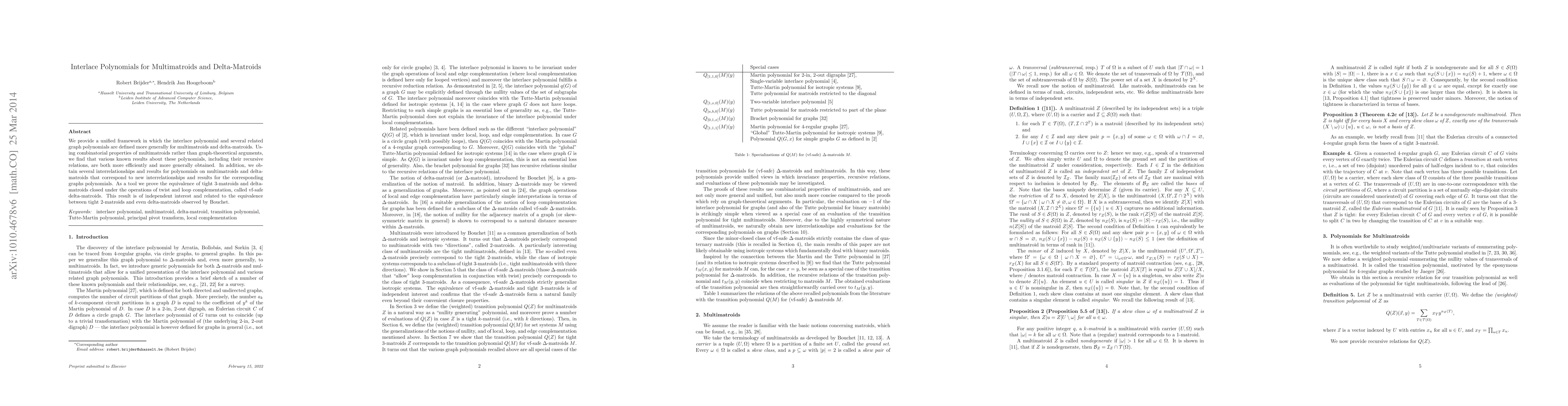 We provide a unified framework in which the interlace polynomial and several related graph polynomials are defined more generally for multimatroids and delta-matroids. Using combinatorial properties of multimatroids rather than graph-theoretical arguments, we find that various known results about these polynomials, including their recursive relations, are both more efficiently and more generally obtained. In addition, we obtain several interrelationships and results for polynomials on multimatroids and delta-matroids that correspond to new interrelationships and results for the corresponding graphs polynomials. As a tool we prove the equivalence of tight 3-matroids and delta-matroids closed under the operations of twist and loop complementation, called vf-safe delta-matroids. This result is of independent interest and related to the equivalence between tight 2-matroids and even delta-matroids observed by Bouchet.