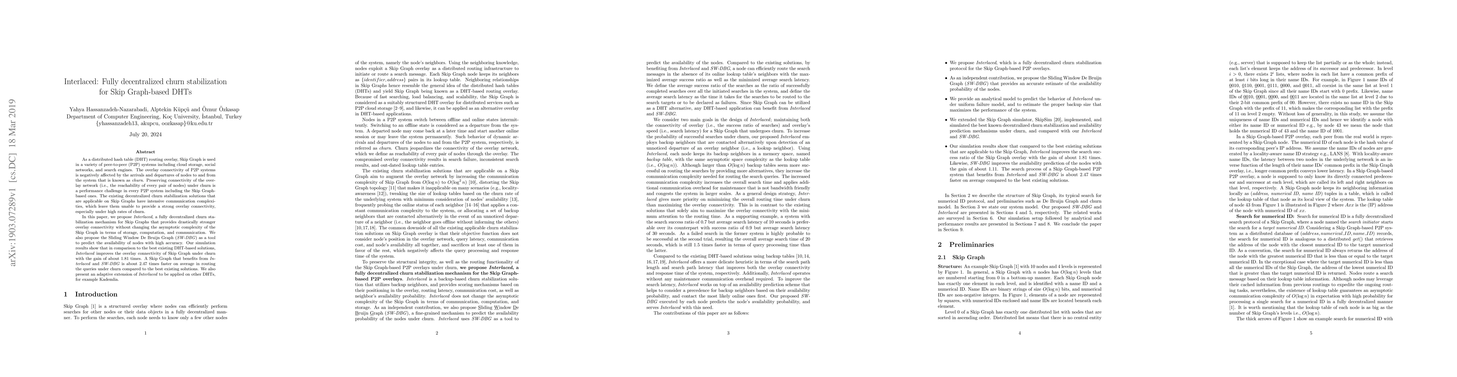 This paper introduces Interlaced, a decentralized churn stabilization mechanism for Skip Graph-based DHTs, enhancing overlay connectivity by 1.81 times under churn compared to existing solutions. It also presents the Sliding Window De Bruijn Graph (SW-DBG) for accurate node availability prediction, improving query routing speed by 2.47 times on average under churn. The method is adaptable for other DHTs like Kademlia.