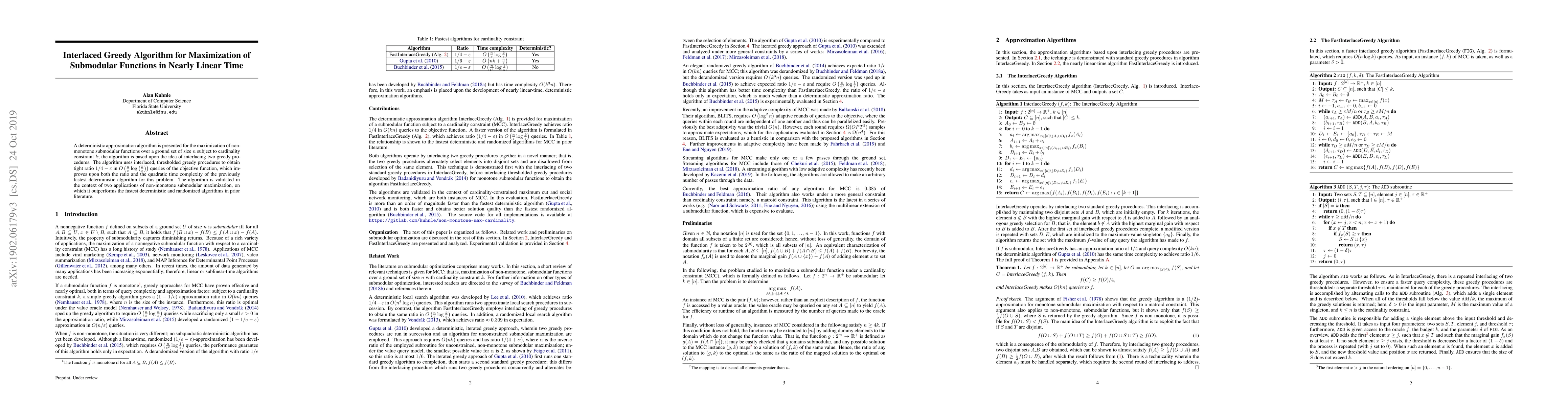 A deterministic approximation algorithm is presented for the maximization of non-monotone submodular functions over a ground set of size $n$ subject to cardinality constraint $k$; the algorithm is based upon the idea of interlacing two greedy procedures. The algorithm uses interlaced, thresholded greedy procedures to obtain tight ratio $1/4 - \epsilon$ in $O \left( \frac{n}{\epsilon} \log \left( \frac{k}{\epsilon} \right) \right)$ queries of the objective function, which improves upon both the ratio and the quadratic time complexity of the previously fastest deterministic algorithm for this problem. The algorithm is validated in the context of two applications of non-monotone submodular maximization, on which it outperforms the fastest deterministic and randomized algorithms in prior literature.