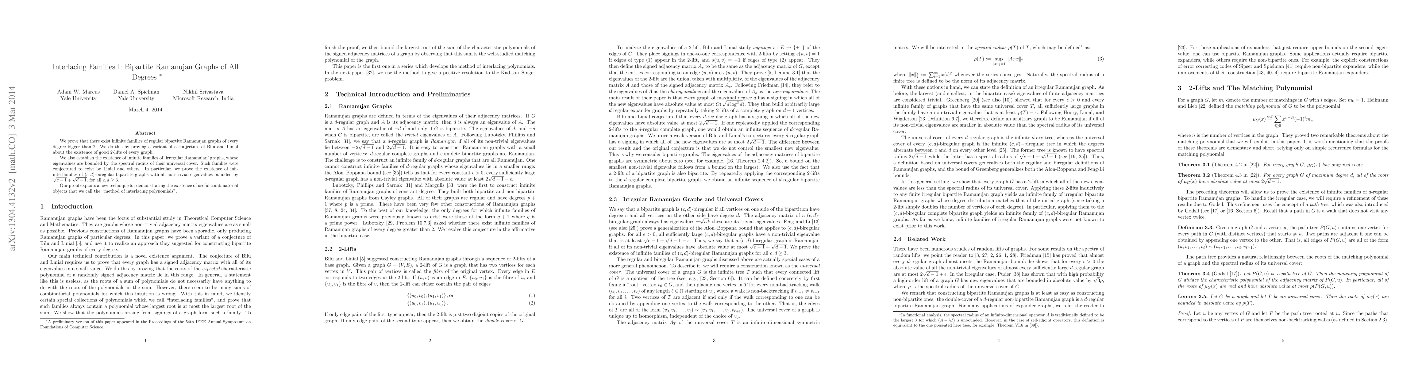Summary: The paper proves the existence of infinite families of regular and irregular Ramanujan graphs of any degree greater than 2, using a new combinatorial technique called the "method of interlacing polynomials," which addresses a conjecture by Bilu and Linial and supports Linial's conjecture about irregular Ramanujan graphs.