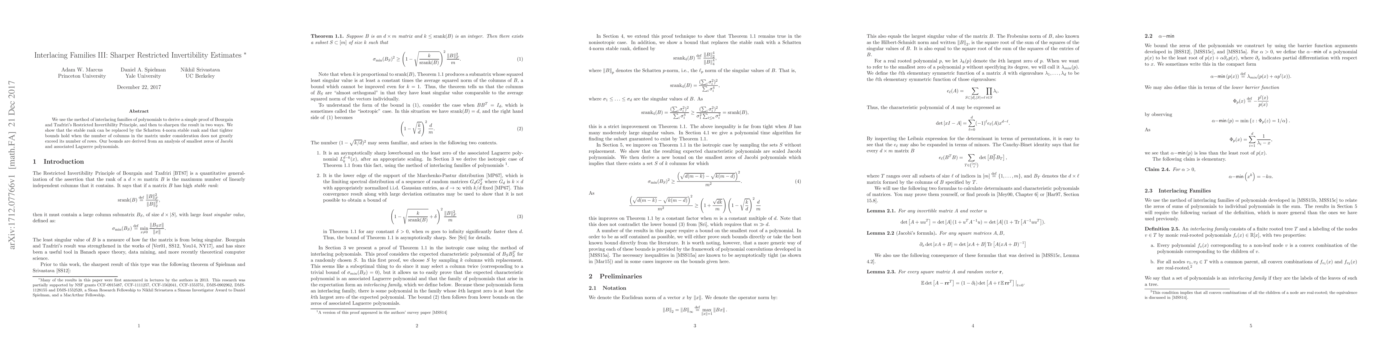 This paper employs interlacing families of polynomials to provide a refined proof of Bourgain and Tzafriri's Restricted Invertibility Principle, replacing stable rank with Schatten 4-norm stable rank and establishing tighter bounds when the number of columns is close to the number of rows. The improved estimates are derived from an analysis of the smallest zeros of Jacobi and Laguerre polynomials.