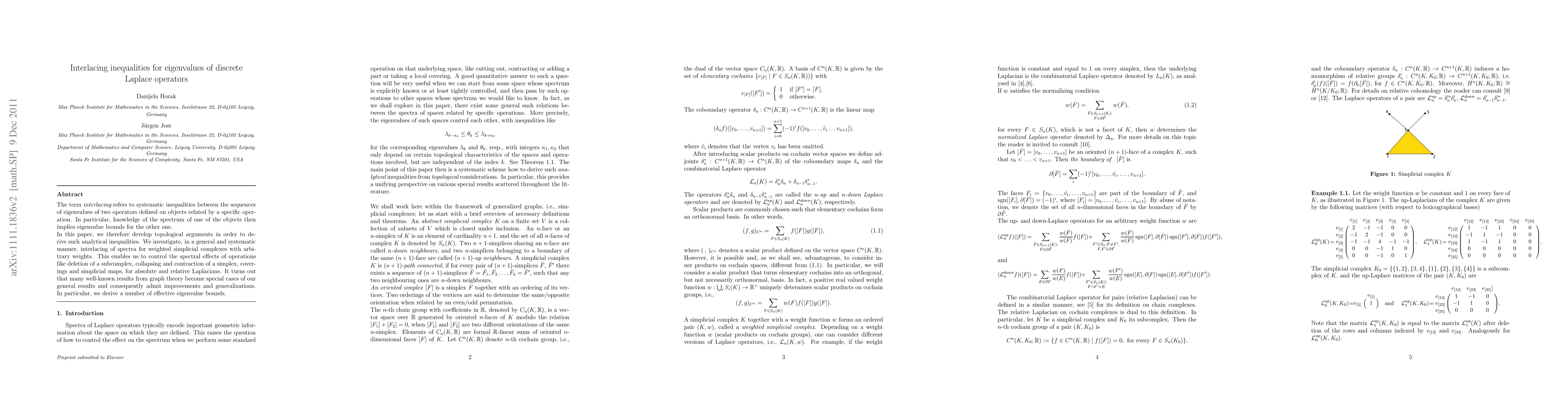 The term interlacing refers to systematic inequalities between the sequences of eigenvalues of two operators defined on objects related by a specific oper- ation. In particular, knowledge of the spectrum of one of the objects then implies eigenvalue bounds for the other one. In this paper, we therefore develop topological arguments in order to de- rive such analytical inequalities. We investigate, in a general and systematic manner, interlacing of spectra for weighted simplicial complexes with arbi- trary weights. This enables us to control the spectral effects of operations like deletion of a subcomplex, collapsing and contraction of a simplex, cover- ings and simplicial maps, for absolute and relative Laplacians. It turns out that many well-known results from graph theory become special cases of our general results and consequently admit improvements and generalizations. In particular, we derive a number of effective eigenvalue bounds.