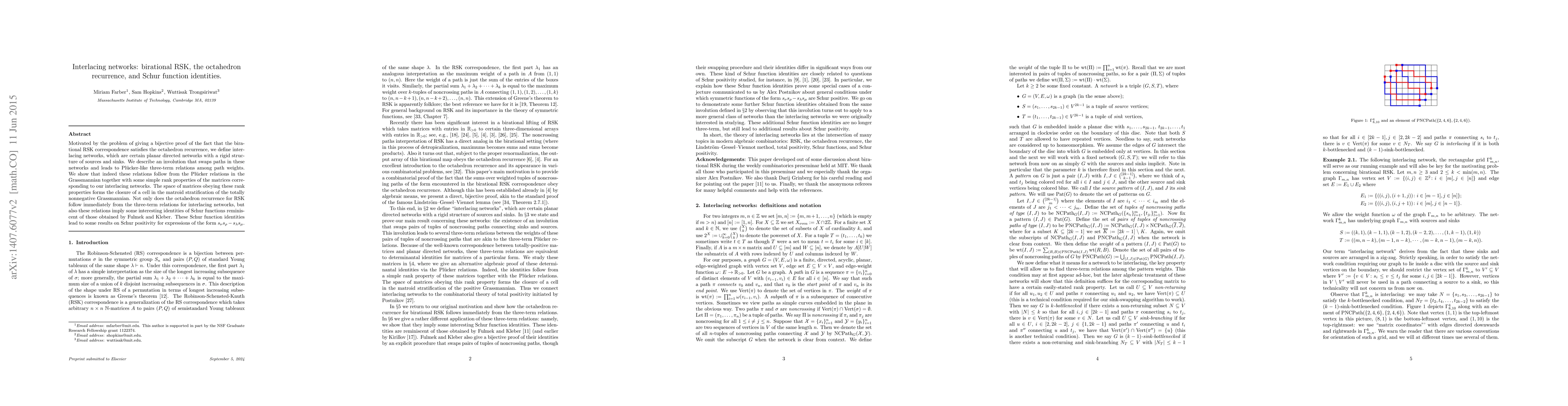 This paper introduces interlacing networks to provide a bijective proof for the birational RSK correspondence's octahedron recurrence and establishes Plückerian three-term relations from these networks. It also uncovers Schur function identities linked to these networks and explores Schur positivity for specific expressions.