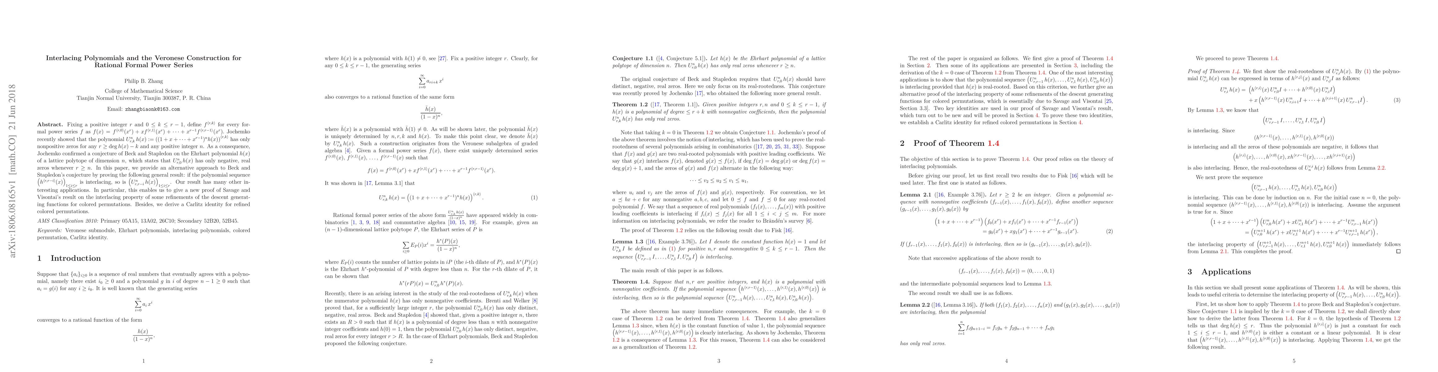 This paper presents an alternative proof for Beck and Stapledon's conjecture regarding the negative real zeros of the Ehrhart polynomial for lattice polytopes, leveraging the interlacing property of polynomial sequences. Additionally, it explores applications including a new proof of interlacing properties for colored permutations and a derived Carlitz identity.