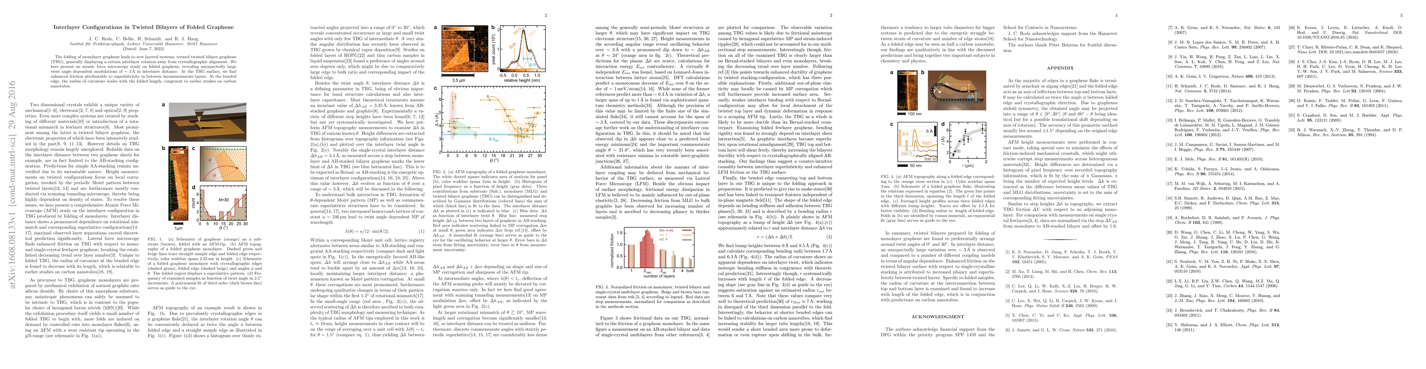 The folding of monolayer graphene leads to new layered systems, termed twisted bilayer graphene (TBG), generally displaying a certain interlayer rotation away from crystallographic alignment. We here present an atomic force microscopy study on folded graphene, revealing unexpectedly large twist angle dependent modulations of ~3 angstrom in interlayer distance. At the TBG surface, we find enhanced friction attributable to superlubricity in between incommensurate layers. At the bended edge, the radius of curvature scales with the folded length, congruent to earlier studies on carbon nanotubes.