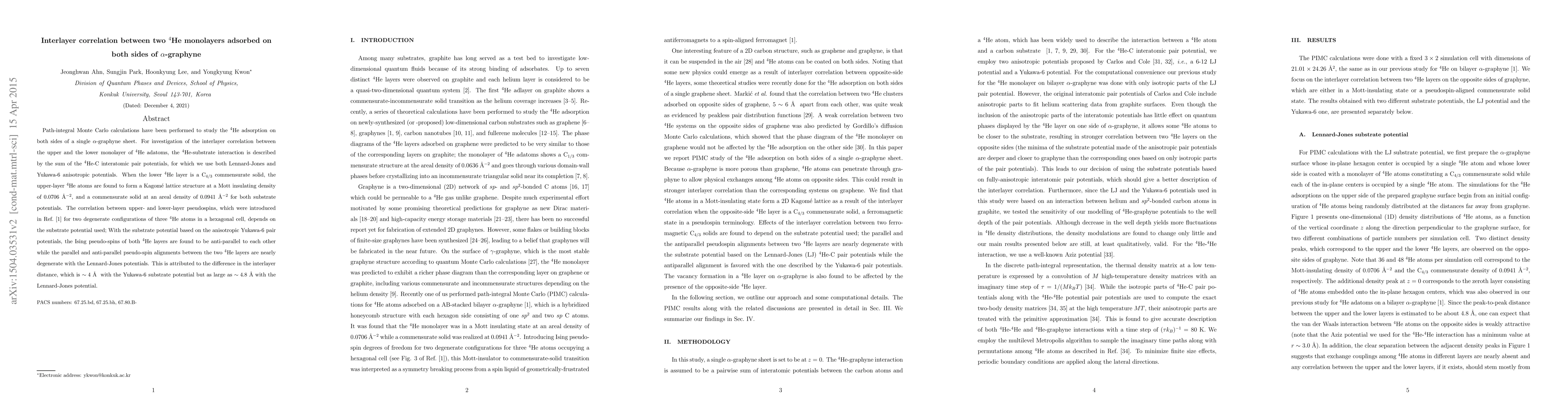 Path-integral Monte Carlo calculations have been performed to study the $^4$He adsorption on both sides of a single $\alpha$-graphyne sheet. For investigation of the interlayer correlation between the upper and the lower monolayer of $^4$He adatoms, the $^4$He-substrate interaction is described by the sum of the $^4$He-C interatomic pair potentials, for which we use both Lennard-Jones and Yukawa-6 anisotropic potentials. When the lower $^4$He layer is a C$_{4/3}$ commensurate solid, the upper-layer $^4$He atoms are found to form a Kagom\'e lattice structure at a Mott insulating density of 0.0706 \AA$^{-2}$, and a commensurate solid at an areal density of 0.0941 \AA$^{-2}$ for both substrate potentials. The correlation between upper- and lower-layer pseudospins, which were introduced in Ref. [1] for two degenerate configurations of three $^4$He atoms in a hexagonal cell, depends on the substrate potential used; With the substrate potential based on the anisotropic Yukawa-6 pair potentials, the Ising pseudo-spins of both $^4$He layers are found to be anti-parallel to each other while the parallel and anti-parallel pseudo-spin alignments between the two $^4$He layers are nearly degenerate with the Lennard-Jones potentials. This is attributed to the difference in the interlayer distance, which is $\sim 4$ \AA~ with the Yukawa-6 substrate potential but as large as $\sim 4.8$ \AA~with the Lennard-Jones potential. [1] Y. Kwon, H. Shin, and H. Lee, Phys. Rev. B 88, 201403(R) (2013)