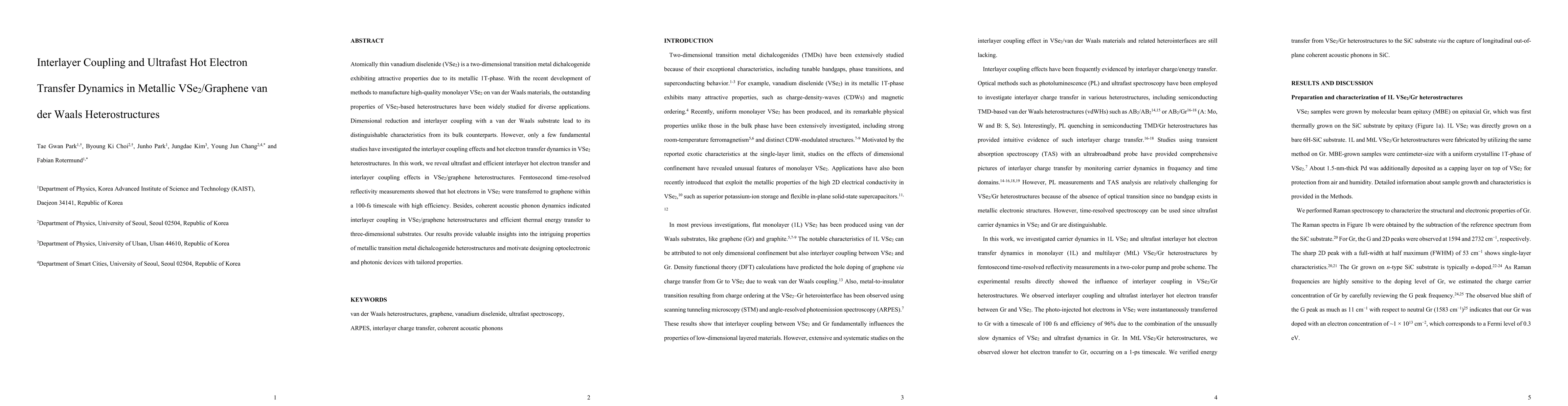 Atomically thin vanadium diselenide (VSe2 ) is a two-dimensional transition metal dichalcogenide exhibiting attractive properties due to its metallic 1T-phase. With the recent development of methods to manufacture high-quality monolayer VSe 2 on van der Waals materials, the outstanding properties of VSe2 -based heterostructures have been widely studied for diverse applications. Dimensional reduction and interlayer coupling with a van der Waals substrate lead to its distinguishable characteristics from its bulk counterparts. However, only a few fundamental studies have investigated the interlayer coupling effects and hot electron transfer dynamics in VSe2 heterostructures. In this work, we reveal ultrafast and efficient interlayer hot electron transfer and interlayer coupling effects in VSe2 /graphene heterostructures. Femtosecond time-resolved reflectivity measurements showed that hot electrons in VSe 2 were transferred to graphene within a 100-fs timescale with high efficiency. Besides, coherent acoustic phonon dynamics indicated interlayer coupling in VSe2 /graphene heterostructures and efficient thermal energy transfer to three-dimensional substrates. Our results provide valuable insights into the intriguing properties of metallic transition metal dichalcogenide heterostructures and motivate designing optoelectronic and photonic devices with tailored properties.