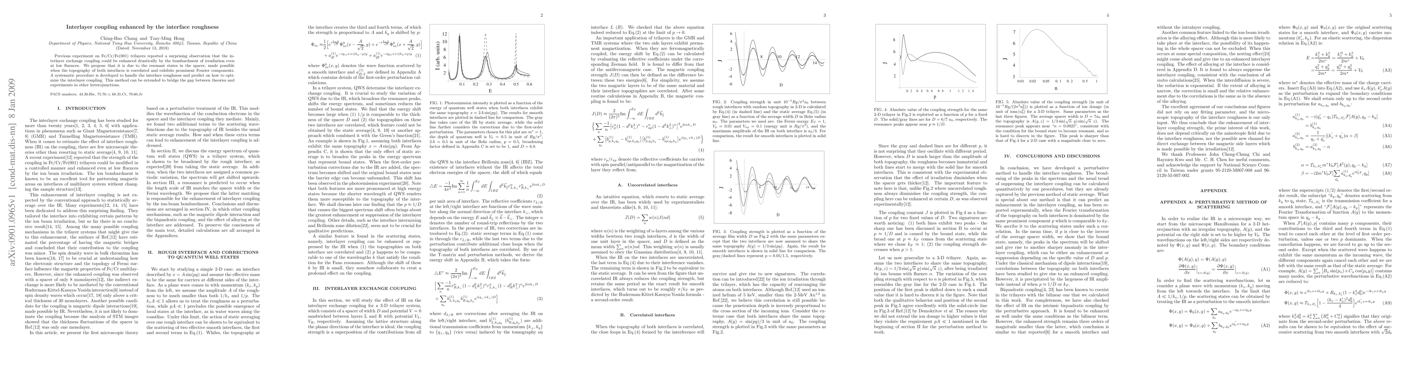 Previous experiment on Fe/Cr/Fe(001) trilayers reported a surprising observation that the interlayer exchange coupling could be enhanced drastically by the bombardment of irradiation even at low fluences. We propose that it is due to the resonant states in the spacer, made possible when the topography of both interfaces is correlated and exhibits prominent Fourier components. A systematic procedure is developed to handle the interface roughness and predict on how to optimize the interlayer coupling. This method can be extended to bridge the gap between theories and experiments in other heterojunctions.