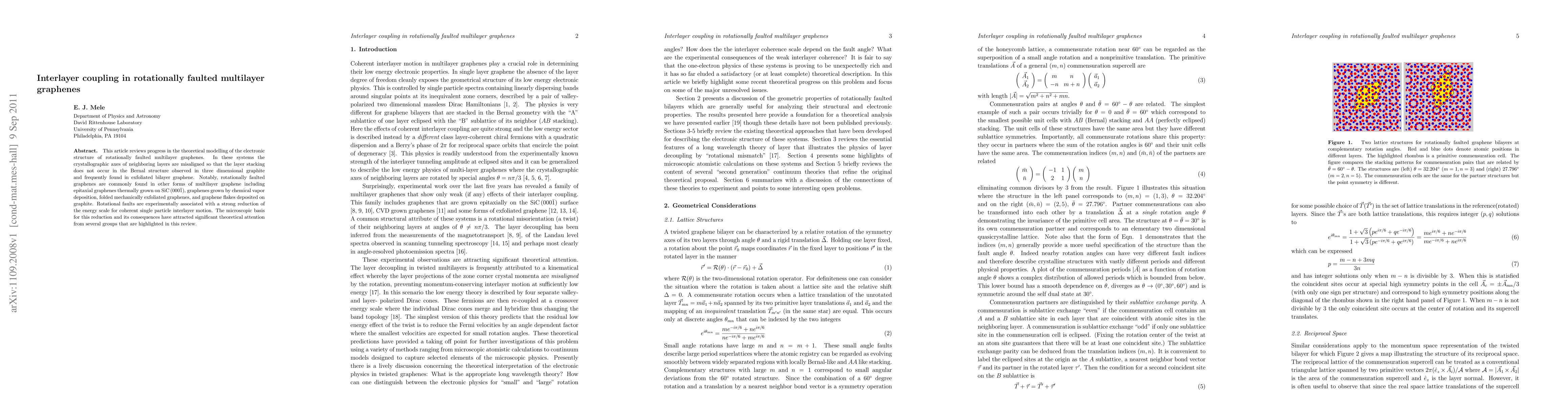 This article reviews progress in the theoretical modelling of the electronic structure of rotationally faulted multilayer graphenes. In these systems the crystallographic axes of neighboring layers are misaligned so that the layer stacking does not occur in the Bernal structure observed in three dimensional graphite and frequently found in exfoliated bilayer graphene. Notably, rotationally faulted graphenes are commonly found in other forms of multilayer graphene including epitaxial graphenes thermally grown on ${\rm SiC \, (000 \bar 1)}$, graphenes grown by chemical vapor deposition, folded mechanically exfoliated graphenes, and graphene flakes deposited on graphite. Rotational faults are experimentally associated with a strong reduction of the energy scale for coherent single particle interlayer motion. The microscopic basis for this reduction and its consequences have attracted significant theoretical attention from several groups that are highlighted in this review.