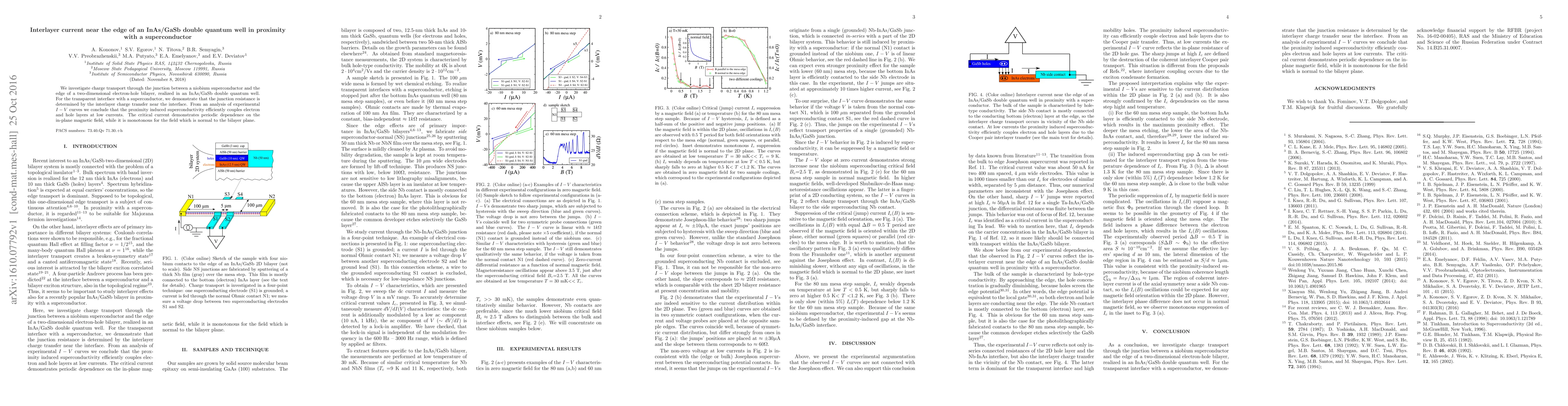 This study investigates charge transport at the interface between a niobium superconductor and an InAs/GaSb double quantum well, showing that junction resistance is governed by interlayer current transfer. Experimental results reveal efficient coupling of electron and hole layers via proximity-induced superconductivity, with critical current exhibiting periodic dependence on in-plane magnetic fields.