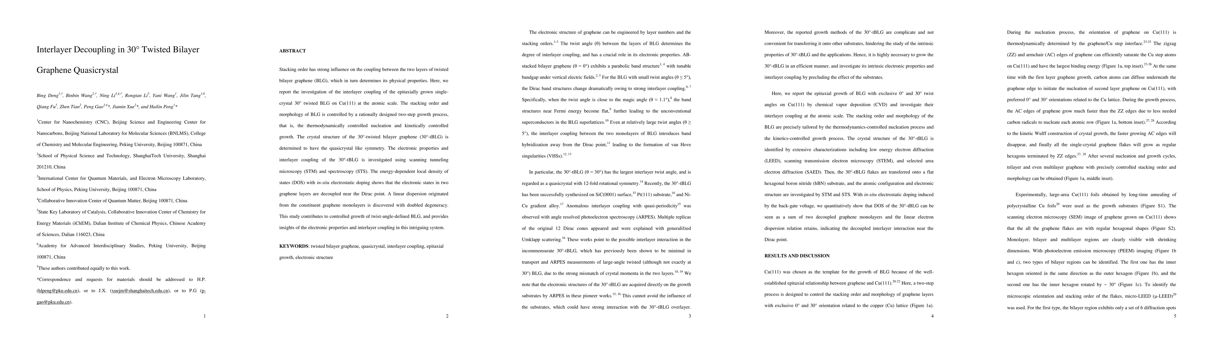 This research investigates the electronic properties and interlayer coupling in 30° twisted bilayer graphene grown on Cu(111) using a two-step growth process. The study reveals decoupling of electronic states near the Dirac point and identifies a quasicrystal-like symmetry in the crystal structure, contributing to the understanding of twist-angle-defined bilayer graphene.