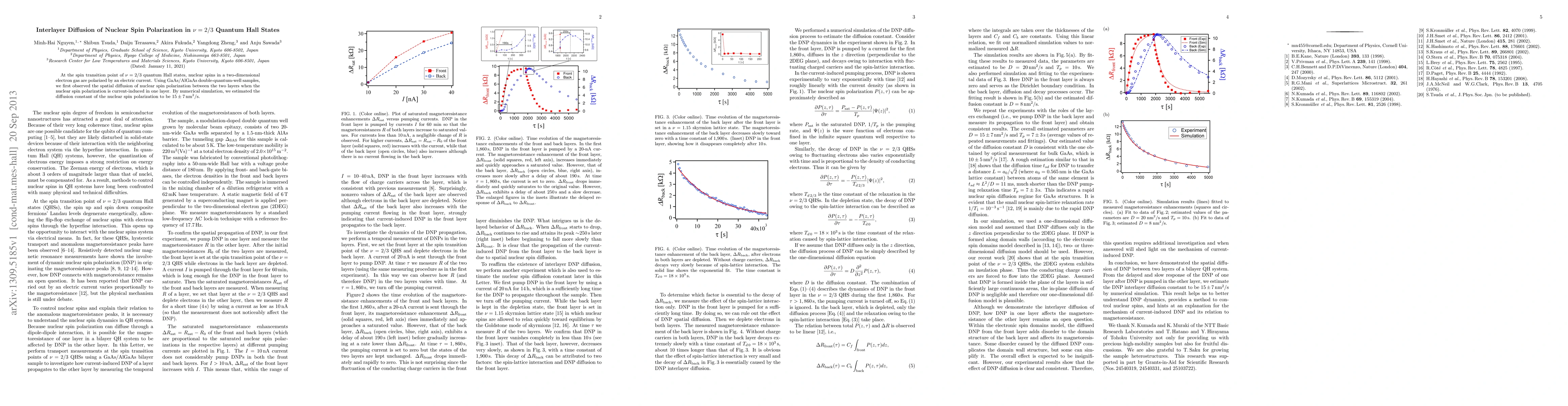 The research observes interlayer diffusion of nuclear spin polarization in $\nu=2/3$ quantum Hall states using GaAs/AlGaAs double-quantum-well samples, finding a diffusion constant of $15 \pm 7$ nm$^2$/s through numerical simulation.