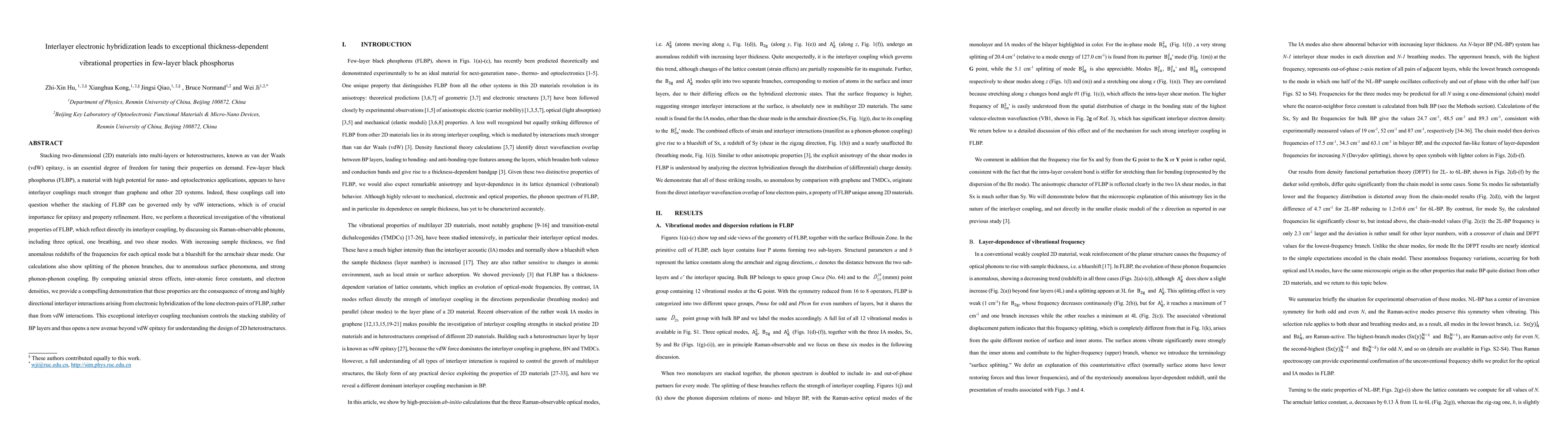 This paper investigates the thickness-dependent vibrational properties of few-layer black phosphorus (FLBP), revealing anomalous redshifts in optical phonon frequencies and a blueshift in the armchair shear mode due to strong interlayer electronic hybridization rather than van der Waals interactions. These findings suggest a new mechanism for controlling the stacking stability of BP layers beyond traditional vdW epitaxy.