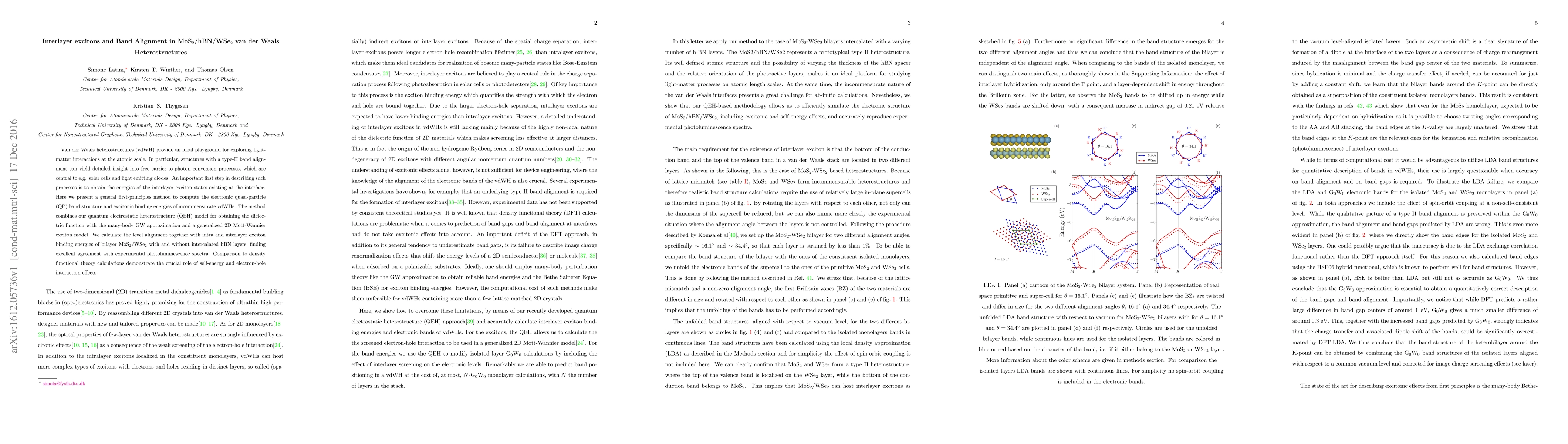 Van der Waals heterostructures (vdWH) provide an ideal playground for exploring light-matter interactions at the atomic scale. In particular, structures with a type-II band alignment can yield detailed insight into free carrier-to-photon conversion processes, which are central to e.g. solar cells and light emitting diodes. An important first step in describing such processes is to obtain the energies of the interlayer exciton states existing at the interface. Here we present a general first-principles method to compute the electronic quasi-particle (QP) band structure and excitonic binding energies of incommensurate vdWHs. The method combines our quantum electrostatic heterostructure (QEH) model for obtaining the dielectric function with the many-body GW approximation and a generalized 2D Mott-Wannier exciton model. We calculate the level alignment together with intra and interlayer exciton binding energies of bilayer MoS$_2$/WSe$_2$ with and without intercalated hBN layers, finding excellent agreement with experimental photoluminescence spectra. Comparison to density functional theory calculations demonstrate the crucial role of self-energy and electron-hole interaction effects.
