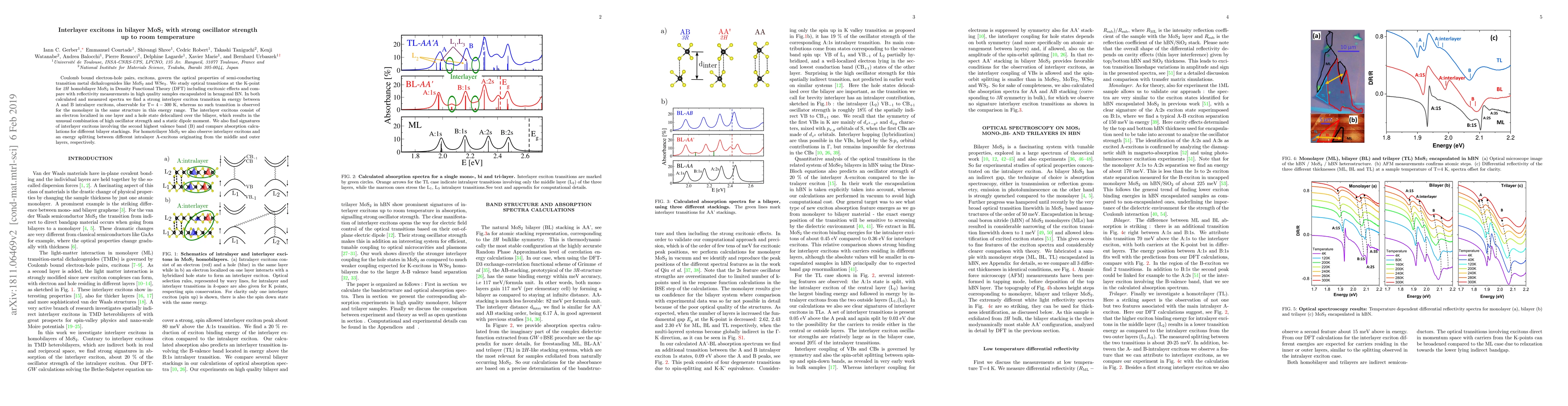 Coulomb bound electron-hole pairs, excitons, govern the optical properties of semi-conducting transition metal dichalcogenides like MoS$_2$ and WSe$_2$. We study optical transitions at the K-point for 2H homobilayer MoS$_2$ in Density Functional Theory (DFT) including excitonic effects and compare with reflectivity measurements in high quality samples encapsulated in hexagonal BN. In both calculated and measured spectra we find a strong interlayer exciton transition in energy between A and B intralayer excitons, observable for T$=4 -300$ K, whereas no such transition is observed for the monolayer in the same structure in this energy range. The interlayer excitons consist of an electron localized in one layer and a hole state delocalized over the bilayer, which results in the unusual combination of high oscillator strength and a static dipole moment. We also find signatures of interlayer excitons involving the second highest valence band (B) and compare absorption calculations for different bilayer stackings. For homotrilayer MoS$_2$ we also observe interlayer excitons and an energy splitting between different intralayer A-excitons originating from the middle and outer layers, respectively.