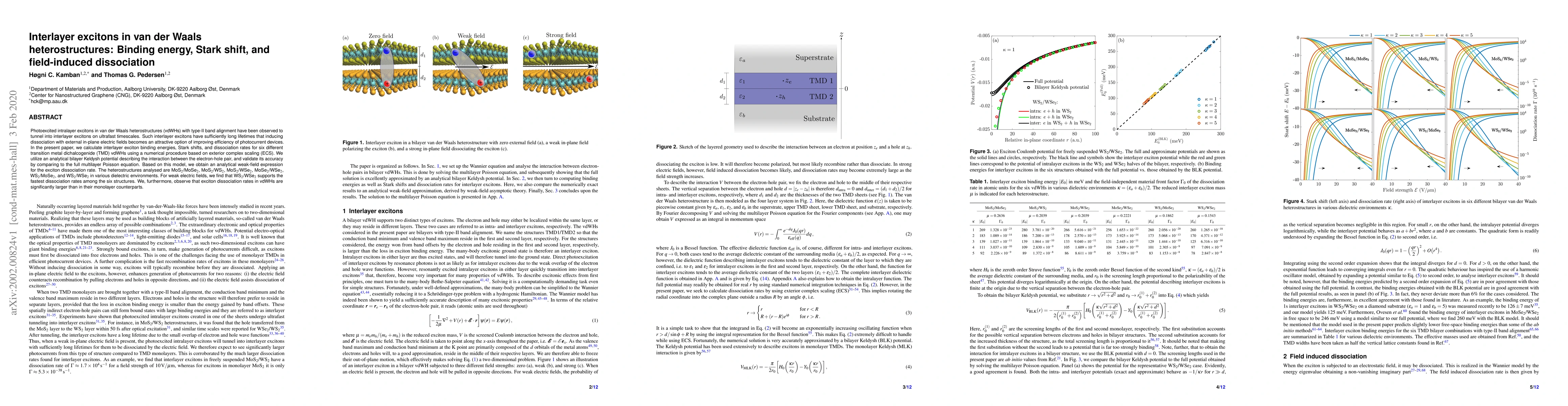 Photoexcited intralayer excitons in van der Waals heterostructures (vdWHs) with type-II band alignment have been observed to tunnel into interlayer excitons on ultrafast timescales. Such interlayer excitons have sufficiently long lifetimes that inducing dissociation with external in-plane electric fields becomes an attractive option of improving efficiency of photocurrent devices. In the present paper, we calculate interlayer exciton binding energies, Stark shifts, and dissociation rates for six different transition metal dichalcogenide (TMD) vdWHs using a numerical procedure based on exterior complex scaling (ECS). We utilize an analytical bilayer Keldysh potential describing the interaction between the electron-hole pair, and validate its accuracy by comparing to the full multilayer Poisson equation. Based on this model, we obtain an analytical weak-field expression for the exciton dissociation rate. The heterostructures analysed are MoS$_2$/MoSe$_2$, MoS$_2$/WS$_2$, MoS$_2$/WSe$_2$, MoSe$_2$/WSe$_2$, WS$_2$/MoSe$_2$, and WS$_2$/WSe$_2$ in various dielectric environments. For weak electric fields, we find that WS$_2$/WSe$_2$ supports the fastest dissociation rates among the six structures. We, furthermore, observe that exciton dissociation rates in vdWHs are significantly larger than in their monolayer counterparts.
