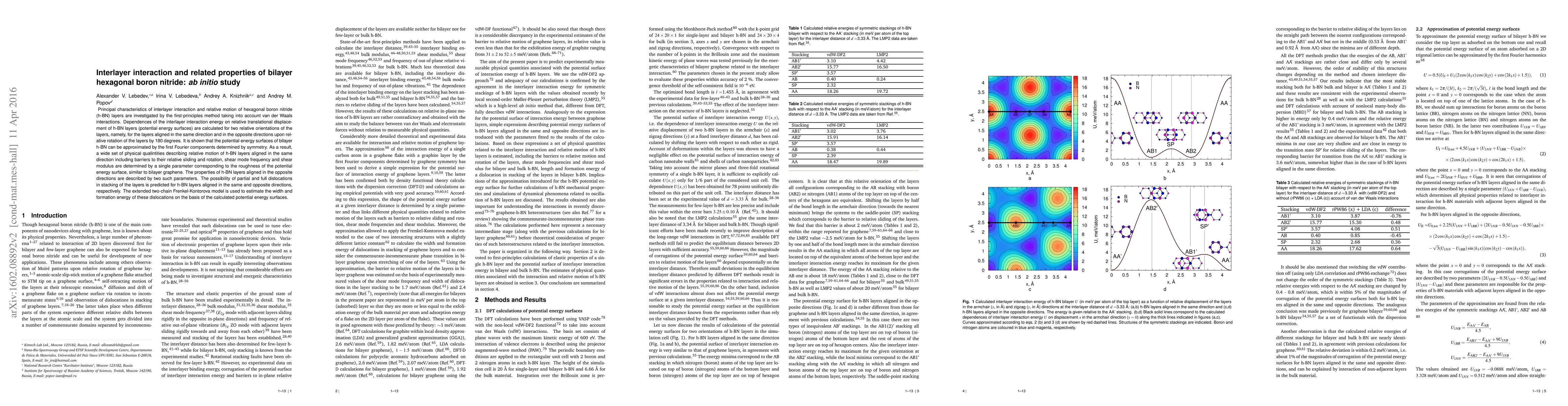 This study investigates the interlayer interaction and properties of bilayer hexagonal boron nitride (h-BN) using first-principles calculations, revealing that the potential energy surfaces can be approximated by Fourier components. It predicts the presence of partial and full dislocations in h-BN layers aligned in the same and opposite directions, respectively, and uses a two-chain Frenkel-Kontorova model to estimate dislocation widths and energies.