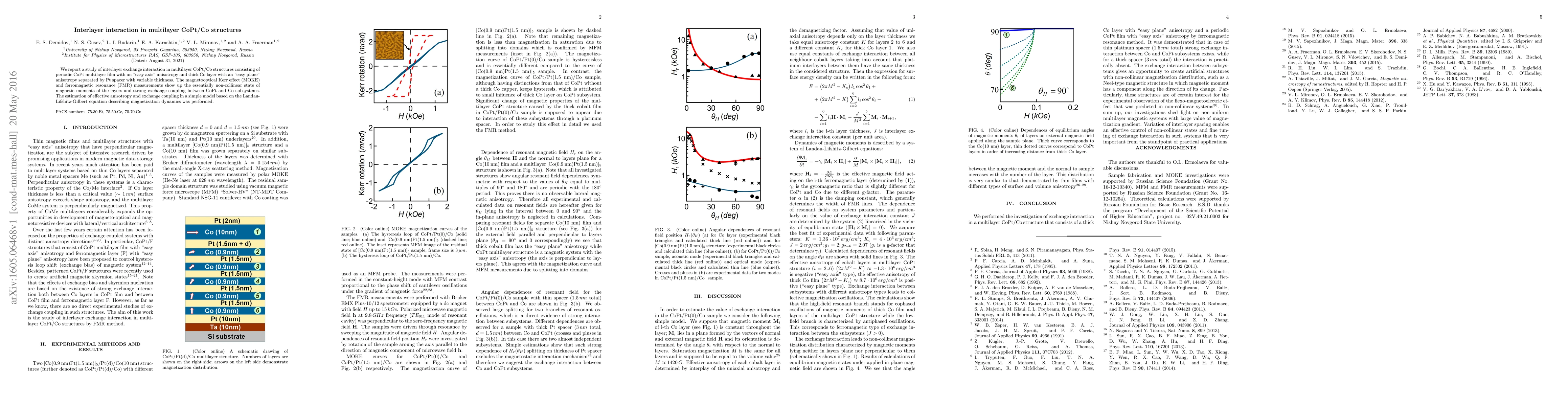 This study investigates the interlayer exchange interaction in CoPt/Co multilayer structures using MOKE and FMR, revealing a non-collinear state and strong coupling. A simple model based on the Landau-Lifshitz-Gilbert equation estimates the effective anisotropy and exchange coupling.