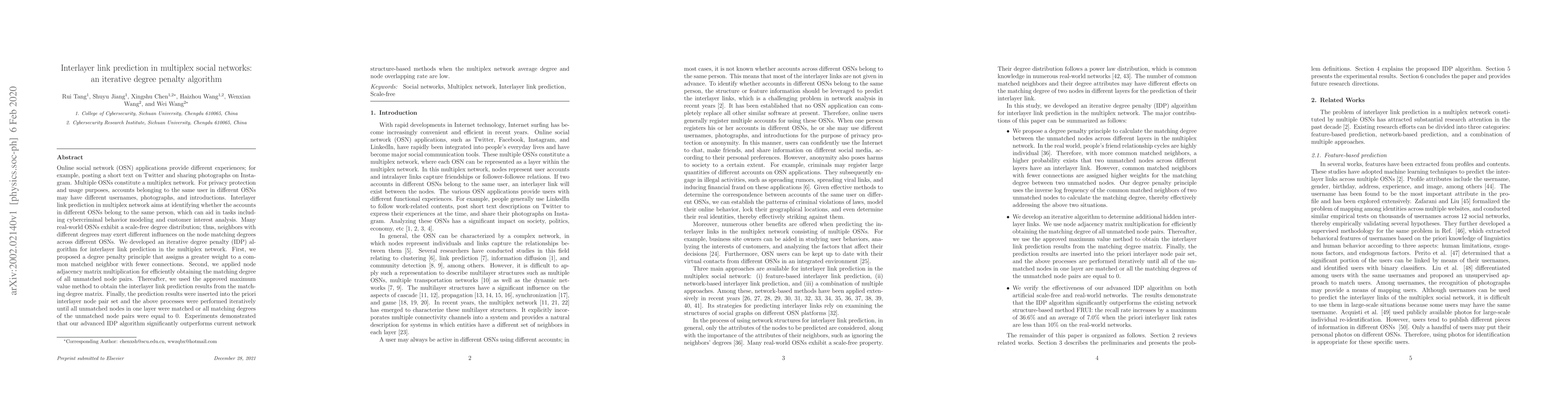 Online social network (OSN) applications provide different experiences; for example, posting a short text on Twitter and sharing photographs on Instagram. Multiple OSNs constitute a multiplex network. For privacy protection and usage purposes, accounts belonging to the same user in different OSNs may have different usernames, photographs, and introductions. Interlayer link prediction in multiplex network aims at identifying whether the accounts in different OSNs belong to the same person, which can aid in tasks including cybercriminal behavior modeling and customer interest analysis. Many real-world OSNs exhibit a scale-free degree distribution; thus, neighbors with different degrees may exert different influences on the node matching degrees across different OSNs. We developed an iterative degree penalty (IDP) algorithm for interlayer link prediction in the multiplex network. First, we proposed a degree penalty principle that assigns a greater weight to a common matched neighbor with fewer connections. Second, we applied node adjacency matrix multiplication for efficiently obtaining the matching degree of all unmatched node pairs. Thereafter, we used the approved maximum value method to obtain the interlayer link prediction results from the matching degree matrix. Finally, the prediction results were inserted into the priori interlayer node pair set and the above processes were performed iteratively until all unmatched nodes in one layer were matched or all matching degrees of the unmatched node pairs were equal to 0. Experiments demonstrated that our advanced IDP algorithm significantly outperforms current network structure-based methods when the multiplex network average degree and node overlapping rate are low.