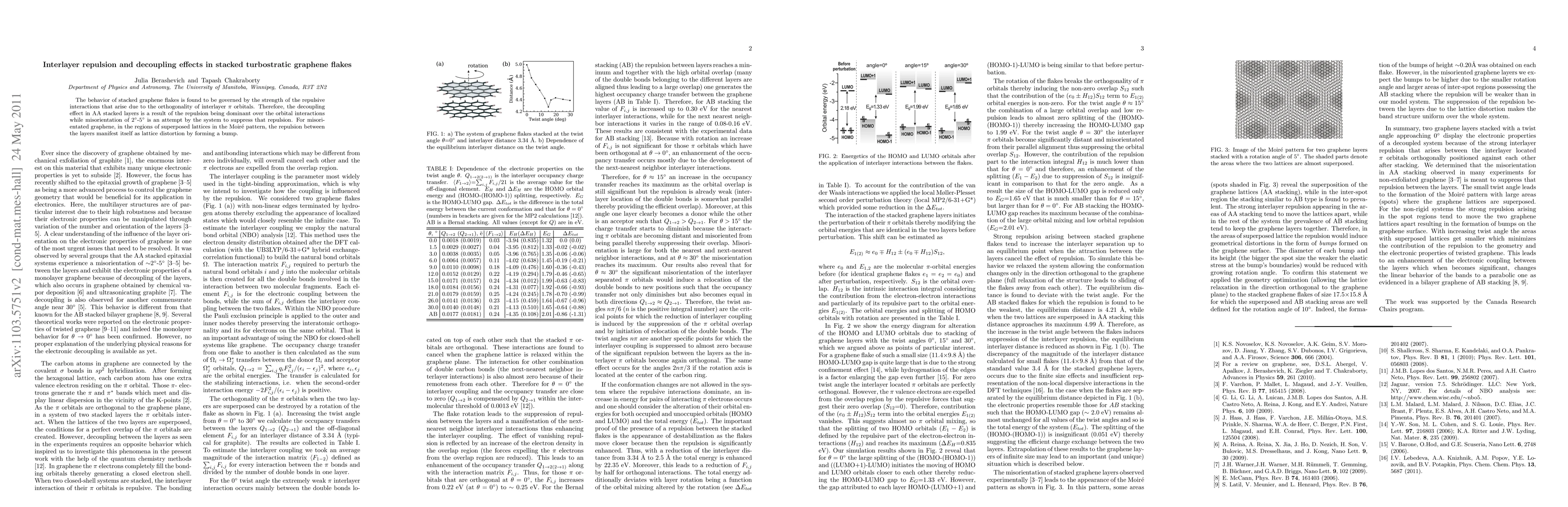 We have explored the electronic properties of stacked graphene flakes with the help of the quantum chemistry methods. We found that the behavior of a bilayer system is governed by the strength of the repulsive interactions that arise between the layers as a result of the orthogonality of their $\pi$ orbitals. The decoupling effect, seen experimentally in AA stacked layers is a result of the repulsion being dominant over the orbital interactions and the observed layer misorientation of 2$^{\circ}-5^{\circ}$ is an attempt by the system to suppress that repulsion and stabilize itself. For misorientated graphene, in the regions of superposed lattices in the Moir\'e pattern, the repulsion between the layers induce lattice distortion in the form of a bump or, in rigid systems local interlayer decoupling.