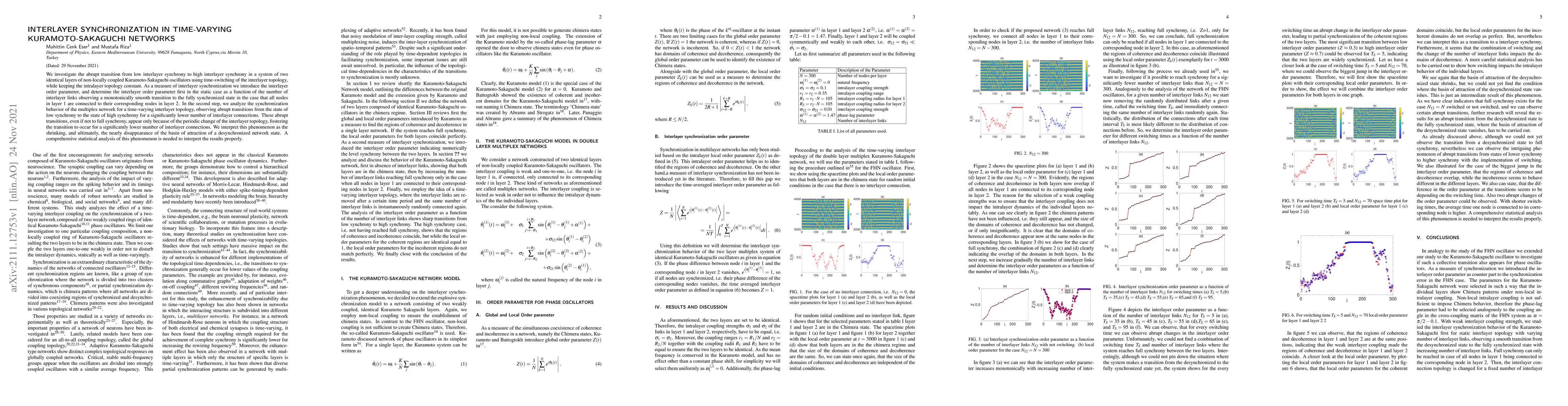 We investigate the abrupt transition from low interlayer synchrony to high interlayer synchrony in a system of two identical layers of non-locally coupled Kuramoto-Sakaguchi oscillators using time-switching of the interlayer topology, while keeping the intralayer topology constant. As a measure of interlayer synchronization we introduce the interlayer order parameter, and determine the interlayer order parameter first in the static case as a function of the number of interlayer links observing a monotonically smooth transition to the fully synchronized state in the case that all nodes in layer 1 are connected to their corresponding nodes in layer 2. In the second step, we analyze the synchronization behavior of the multiplex network for a time-varying interlayer topology, observing abrupt transitions from the state of low synchrony to the state of high synchrony for a significantly lower number of interlayer connections. These abrupt transitions, even if not to full synchrony, appear only because of the periodic change of the interlayer topology, fostering the transition to occur for a significantly lower number of interlayer connections. We interpret this phenomenon as the shrinking, and ultimately, the nearly disappearance of the basin of attraction of a desynchronized network state. A comprehensive statistical analysis of this phenomenon is needed to interpret the results properly.
