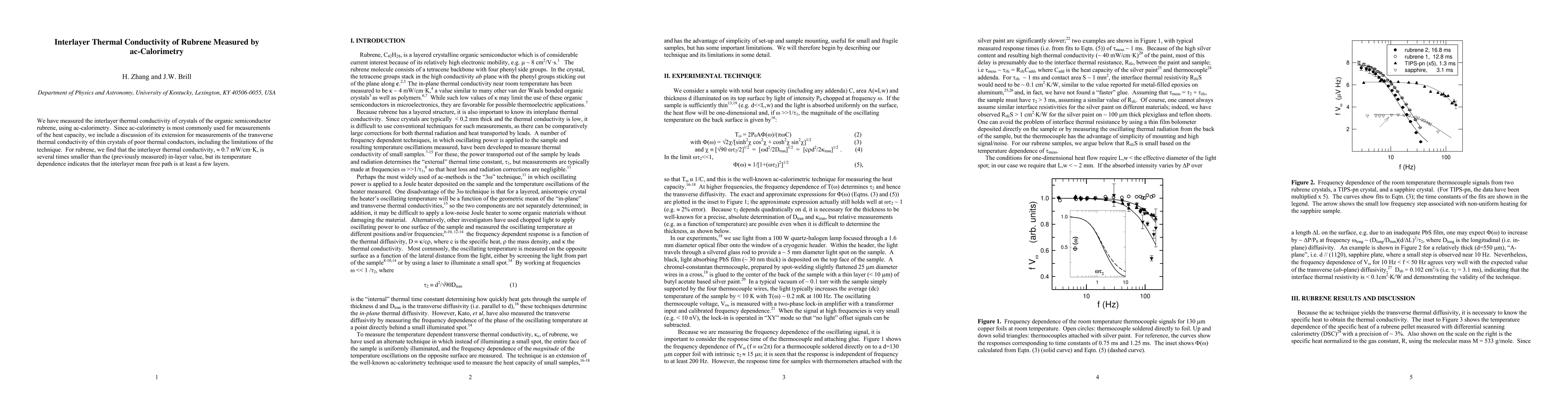 This paper measures the interlayer thermal conductivity of rubrene using ac-calorimetry, finding it to be 0.7 mW/cm K, significantly lower than the in-layer value, with a temperature dependence suggesting a mean free path spanning several layers. The study also discusses the technique's extension and limitations for thin, poor thermal conductors.