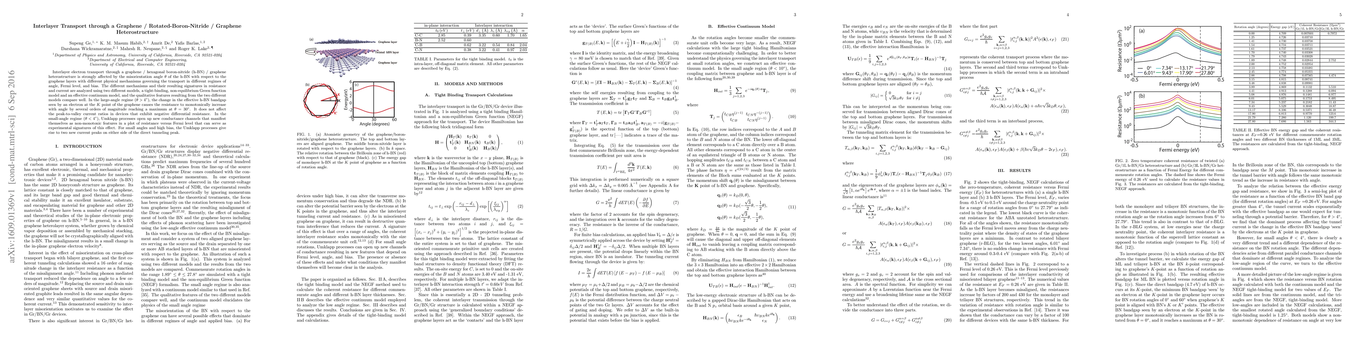 Interlayer electron transport through a graphene / hexagonal boron-nitride (h-BN) / graphene heterostructure is strongly affected by the misorientation angle $\theta$ of the h-BN with respect to the graphene layers with different physical mechanisms governing the transport in different regimes of angle, Fermi level, and bias. The different mechanisms and their resulting signatures in resistance and current are analyzed using two different models, a tight-binding, non-equilibrium Green function model and an effective continuum model, and the qualitative features resulting from the two different models compare well. In the large-angle regime ($\theta > 4^\circ$), the change in the effective h-BN bandgap seen by an electron at the $K$ point of the graphene causes the resistance to monotonically increase with angle by several orders of magnitude reaching a maximum at $\theta = 30^\circ$. It does not affect the peak-to-valley current ratios in devices that exhibit negative differential resistance. In the small-angle regime ($\theta < 4^\circ$), Umklapp processes open up new conductance channels that manifest themselves as non-monotonic features in a plot of resistance versus Fermi level that can serve as experimental signatures of this effect. For small angles and high bias, the Umklapp processes give rise to two new current peaks on either side of the direct tunneling peak.