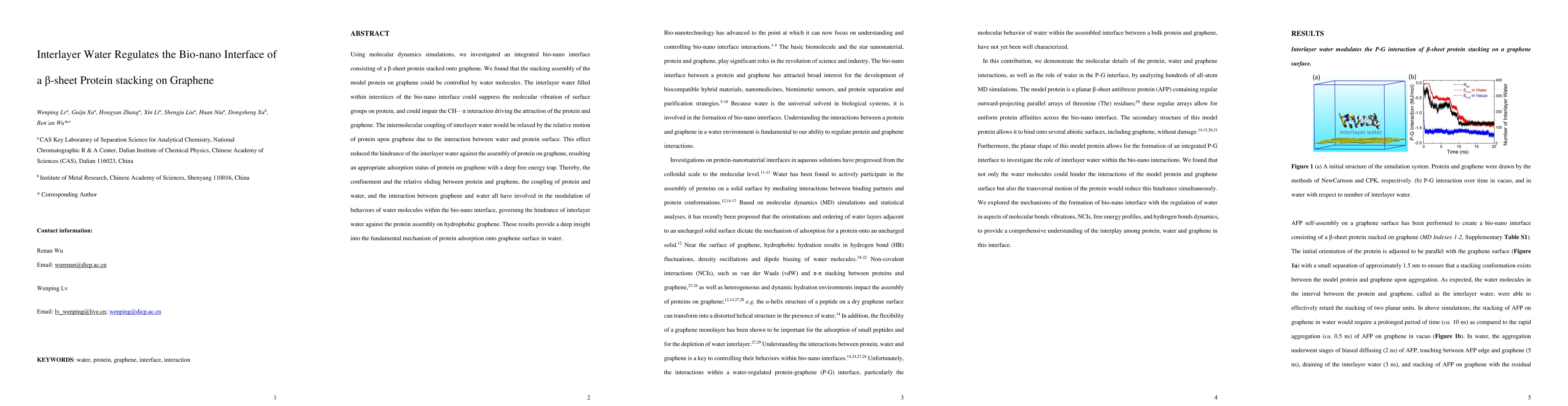 Molecular dynamics simulations were used to investigate an integrated bio-nano interface consisting of a β-sheet protein stacked onto graphene, exploring the role of interlayer water in controlling protein stacking and assembly.