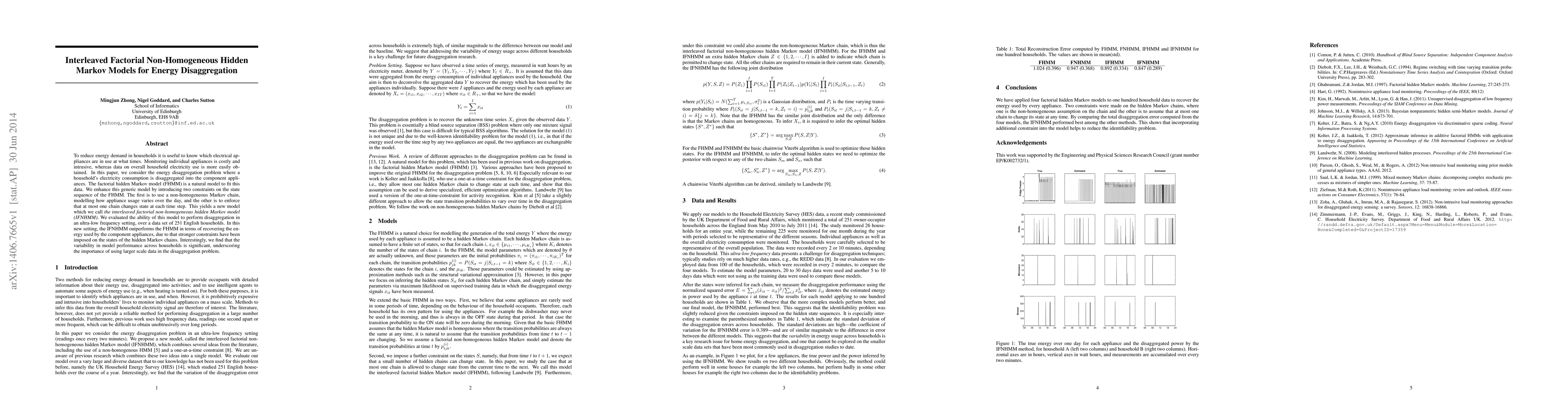 This paper introduces an interleaved factorial non-homogeneous hidden Markov model (IFNHMM) to disaggregate household electricity consumption into individual appliance usage. The IFNHMM outperforms traditional factorial hidden Markov models by incorporating non-homogeneous Markov chains and state constraints, demonstrating better performance in an ultra-low frequency setting across 251 English households.