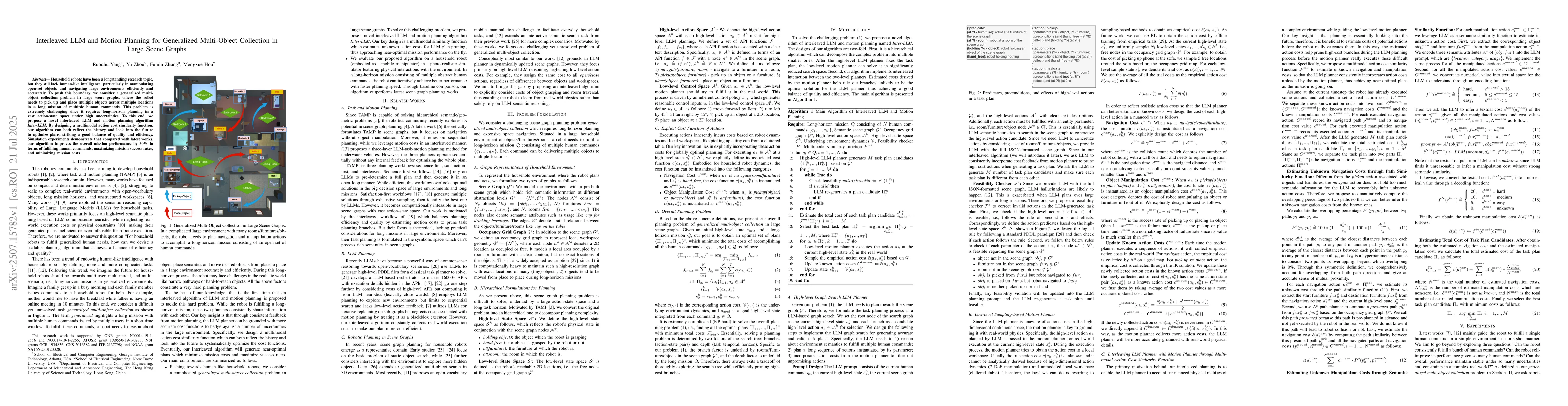 Household robots have been a longstanding research topic, but they still lack human-like intelligence, particularly in manipulating open-set objects and navigating large environments efficiently and accurately. To push this boundary, we consider a generalized multi-object collection problem in large scene graphs, where the robot needs to pick up and place multiple objects across multiple locations in a long mission of multiple human commands. This problem is extremely challenging since it requires long-horizon planning in a vast action-state space under high uncertainties. To this end, we propose a novel interleaved LLM and motion planning algorithm Inter-LLM. By designing a multimodal action cost similarity function, our algorithm can both reflect the history and look into the future to optimize plans, striking a good balance of quality and efficiency. Simulation experiments demonstrate that compared with latest works, our algorithm improves the overall mission performance by 30% in terms of fulfilling human commands, maximizing mission success rates, and minimizing mission costs.