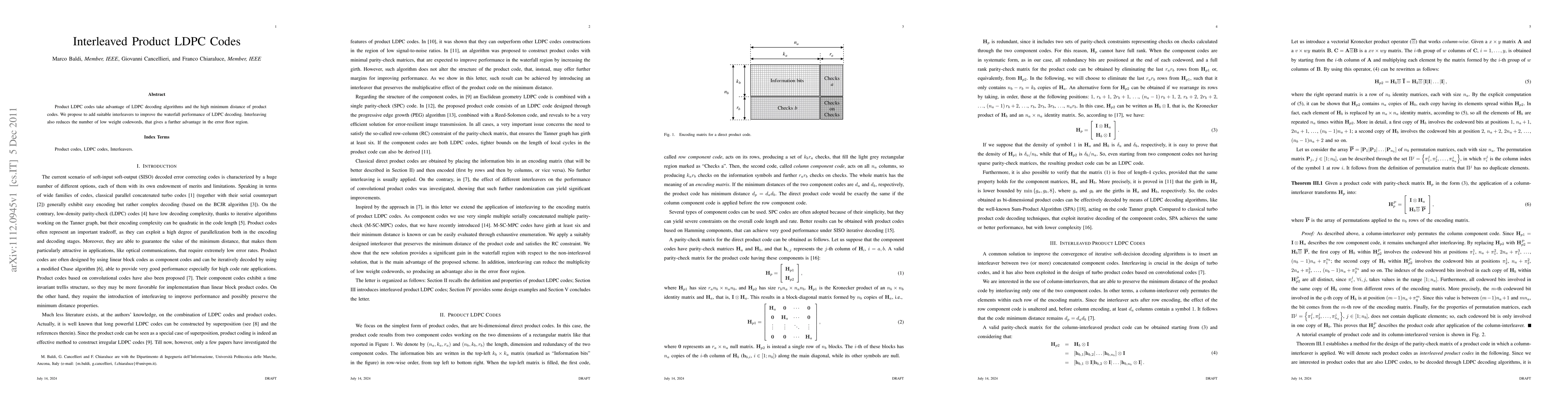 Summary: This paper proposes interleaved product LDPC codes to enhance the decoding performance of LDPC codes, leveraging interleaving to improve waterfall performance and reduce error floors by minimizing low weight codewords.
