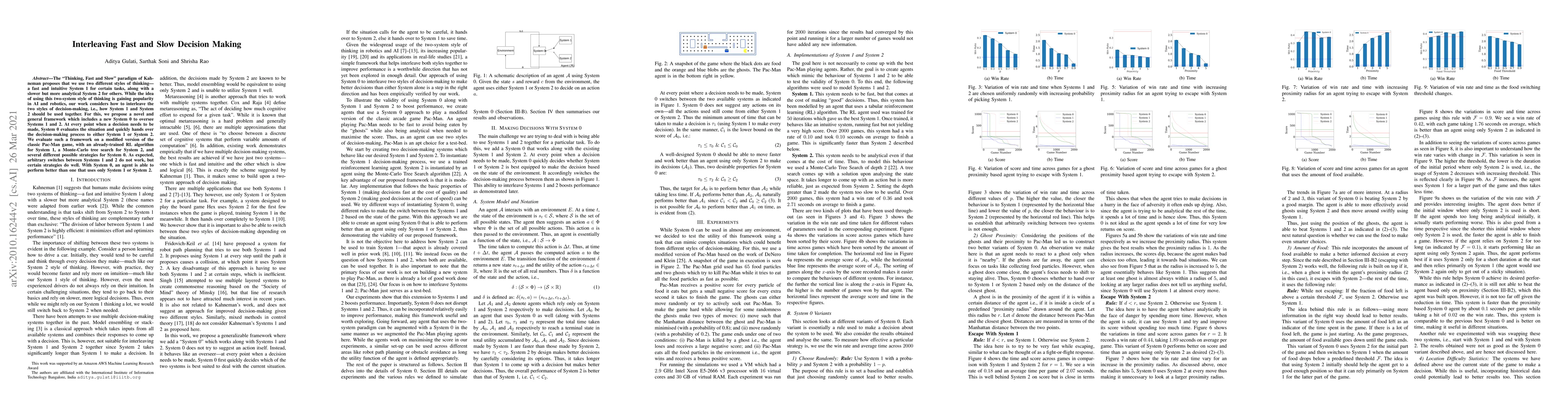 This paper proposes a framework for interleaving fast, intuitive System 1 and slower, analytical System 2 decision-making, introducing System 0 to oversee and manage the transition between them. The framework's effectiveness is demonstrated in a modified Pac-Man game, showing that strategic interleaving outperforms using either system alone.