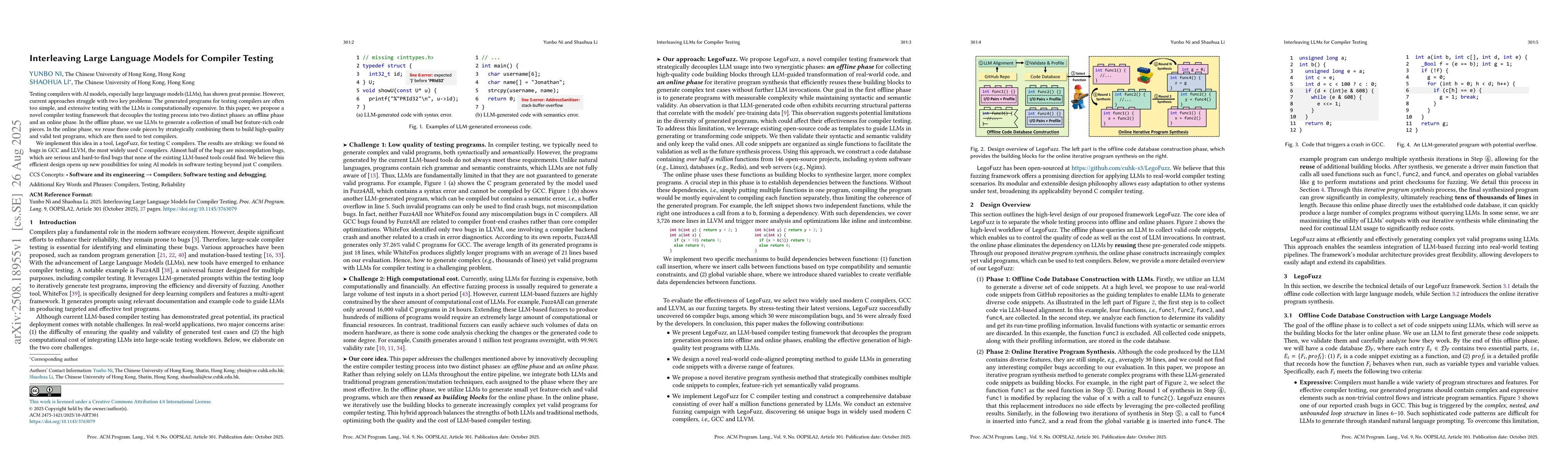 Testing compilers with AI models, especially large language models (LLMs), has shown great promise. However, current approaches struggle with two key problems: The generated programs for testing compilers are often too simple, and extensive testing with the LLMs is computationally expensive. In this paper, we propose a novel compiler testing framework that decouples the testing process into two distinct phases: an offline phase and an online phase. In the offline phase, we use LLMs to generate a collection of small but feature-rich code pieces. In the online phase, we reuse these code pieces by strategically combining them to build high-quality and valid test programs, which are then used to test compilers. We implement this idea in a tool, LegoFuzz, for testing C compilers. The results are striking: we found 66 bugs in GCC and LLVM, the most widely used C compilers. Almost half of the bugs are miscompilation bugs, which are serious and hard-to-find bugs that none of the existing LLM-based tools could find. We believe this efficient design opens up new possibilities for using AI models in software testing beyond just C compilers.